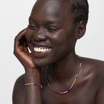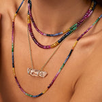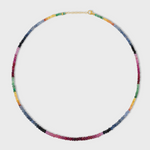 Joyful Rainbow Sapphire necklace with 14 karat gold brings together the vibrant natural colors of our earth. Perfect for any day to bring joy and rebalancing to our lives.