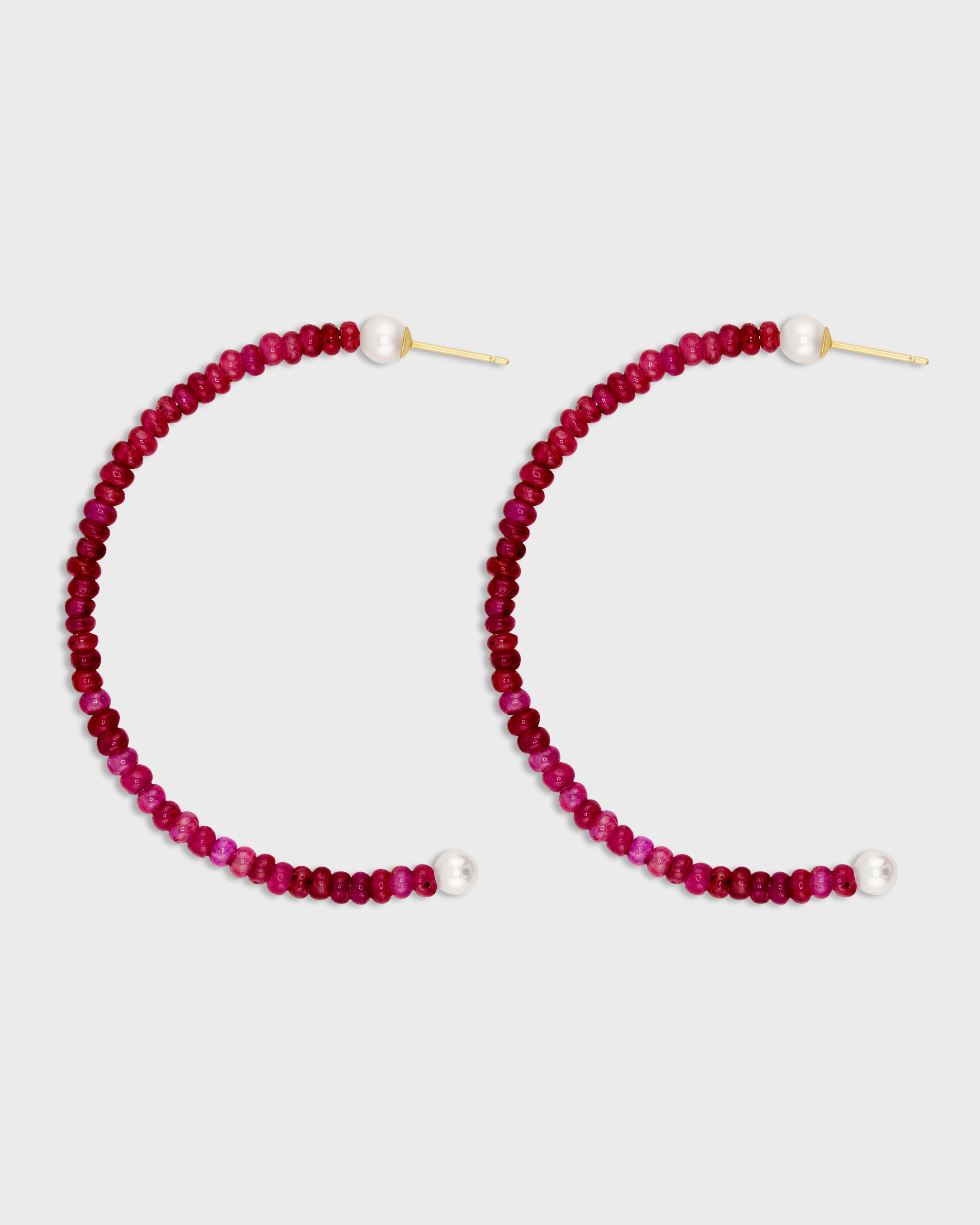 These earrings feature a lovely arrangement of small blue sapphire beads, forming an elegant hoop with a polished pearl on each end. The blue beads, adding a touch of luxury, while the pearls on the tips bring a classic element to the design.