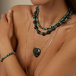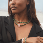 Each beaded jewelry piece is hand strung from the highest quality materials that are cut from natural mineral sources. They are sensitive to prolonged exposure to hairsprays and scents. To ensure longevity please be gentle and avoid tugging and pulling of these pieces.