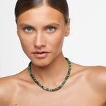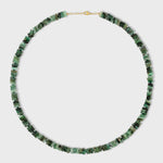 Beautiful faceted cut emerald gemstone that is hand knotted and finished in 14 karat gold.