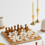Hand-carved from elegant marble and onyx, this refined chess set features naturally veined stone pieces and a polished checkered board — a timeless display of craftsmanship and sophistication for both play and decor.