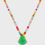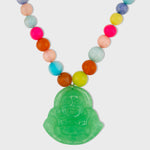 The Happy Buddha Rainbow Opal Jade Necklace features a cheerful jade Buddha pendant, symbolizing joy and serenity, surrounded by vibrant rainbow opal beads that evoke positivity and balance. This playful and colorful design is meant to uplift and inspire the wearer with its energetic charm.
