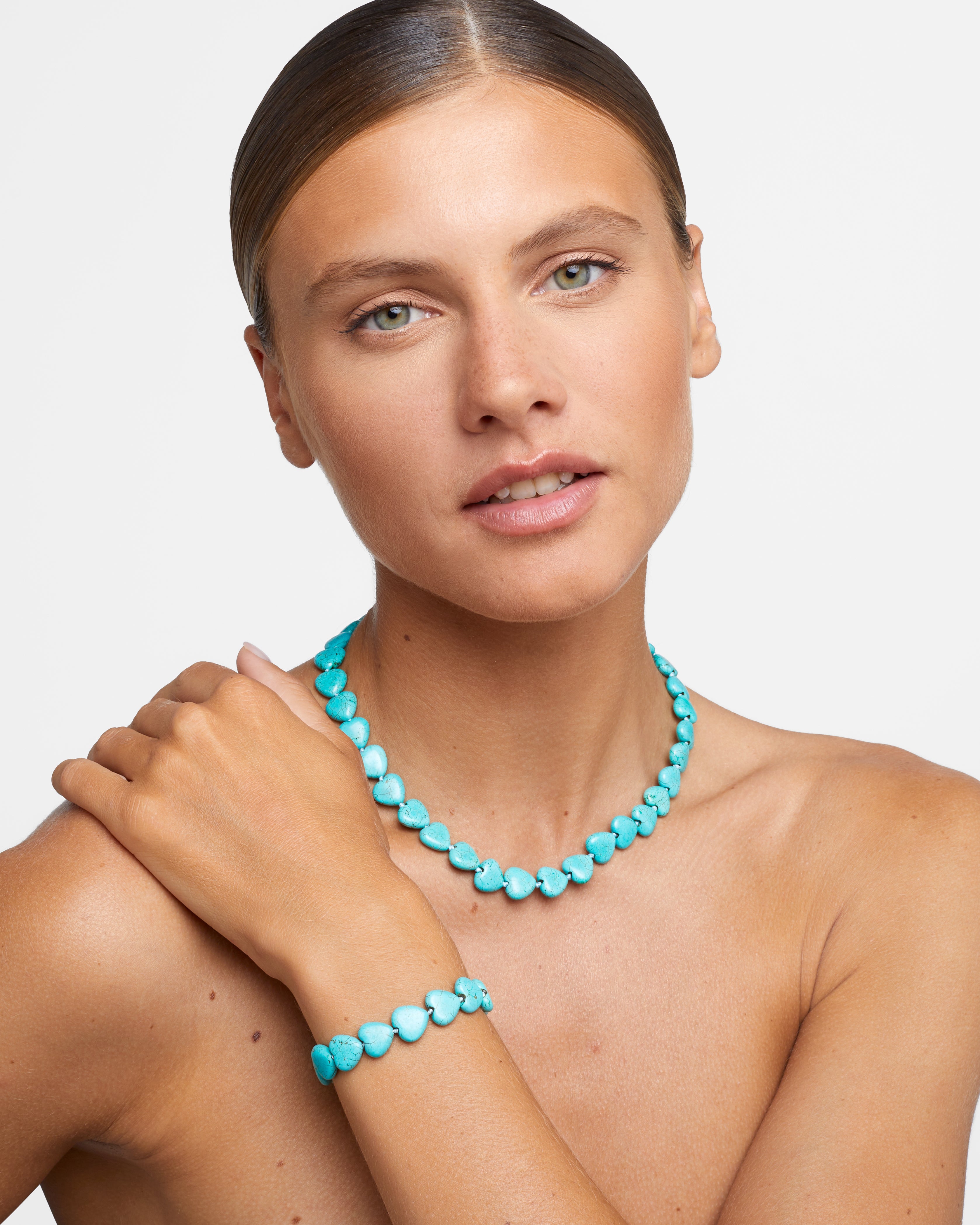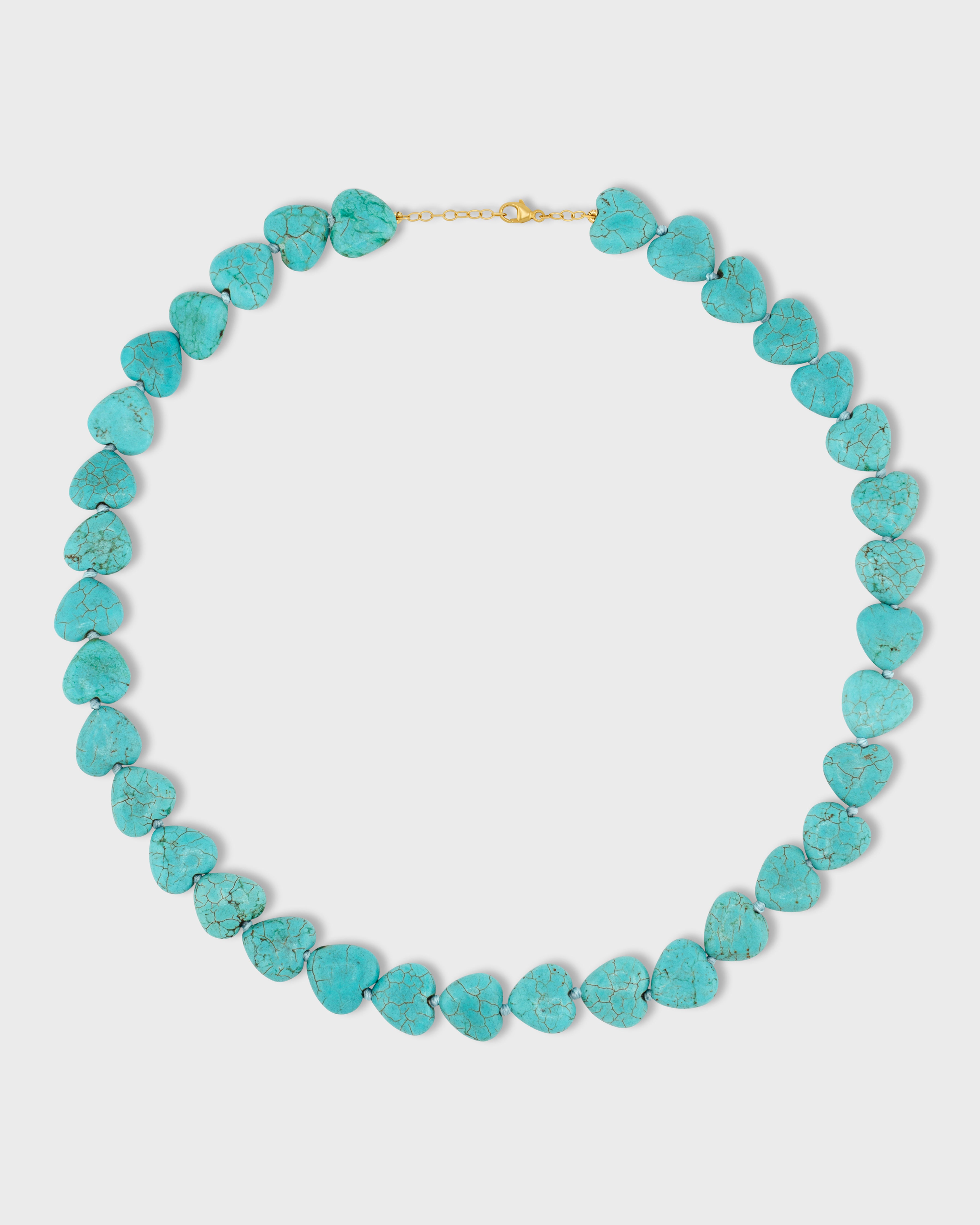Bright blue natural turquoise hearts hand strung in New York City and finished with 14 karat gold.