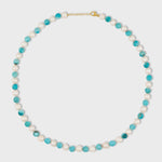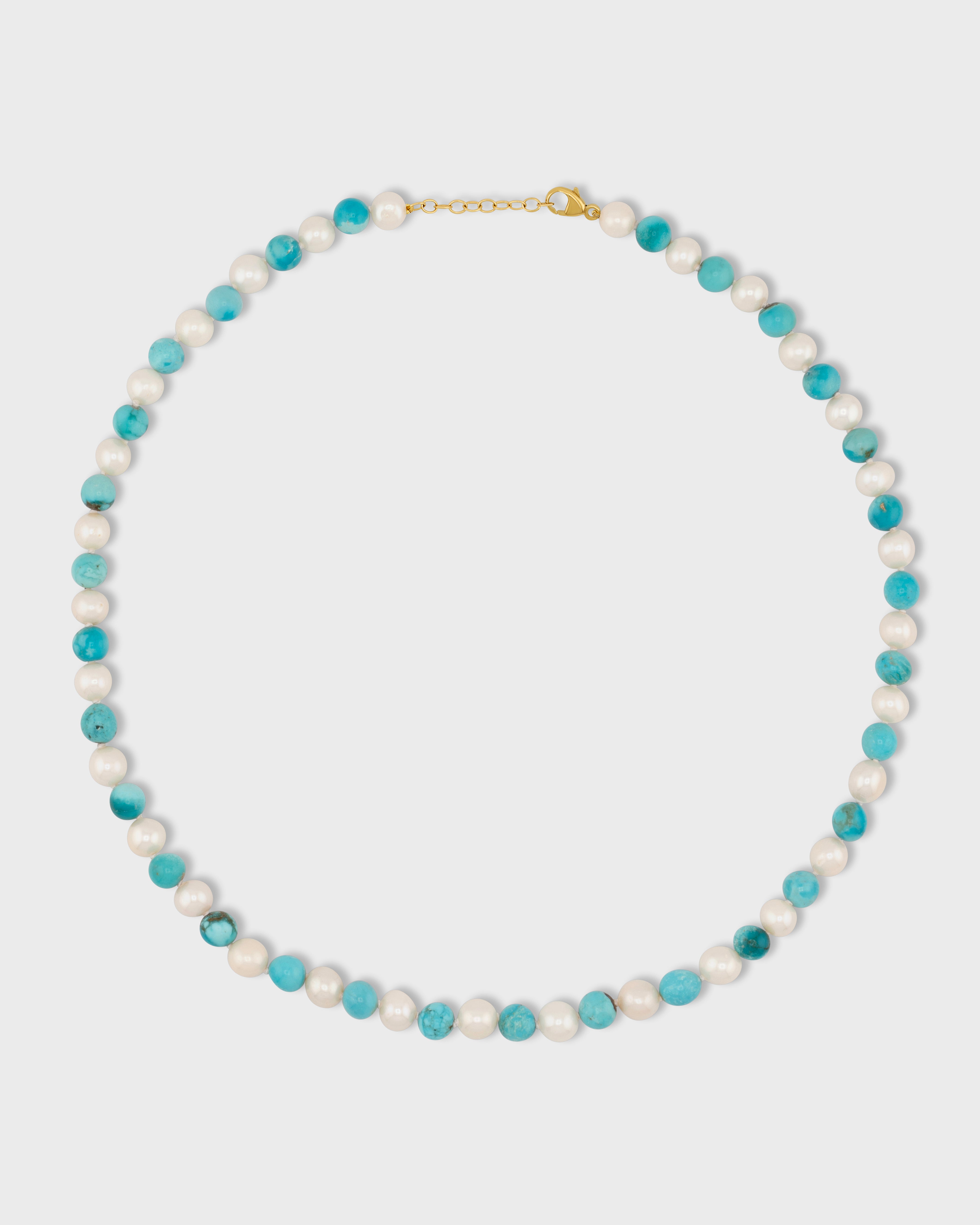 This elegant necklace features lustrous white pearls paired with vibrant turquoise beads, strung by hand in New York City on a 14k gold chain and clasp.
