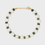Handstrung in the heart of NYC, this exquisite piece features a beautiful combination of emerald and jumbo pearls, creating a stunning contrast that will surely turn heads. The 14k gold chain and clasp add a luxurious touch, making this bracelet the perfect accessory for any occasion.