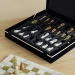 This handcrafted Onyx Chess Set showcases beautifully polished pieces in natural shades of green, white, and earthy tones, creating an elegant and timeless design. Each piece is meticulously carved, offering a unique blend of artistry and functionality. A stunning addition to any space, this chess set is perfect for collectors or those seeking a sophisticated way to enjoy a classic game.
