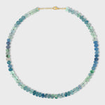 Luminous rainbow fluorite hand strung in New York City and finished with 14 karat yellow gold.