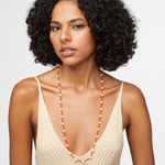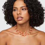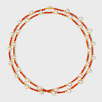 Warm and inviting, this carnelian necklace features fiery hues complemented by pearls and gold beads. Its double-strand length offers a rich, versatile aesthetic.