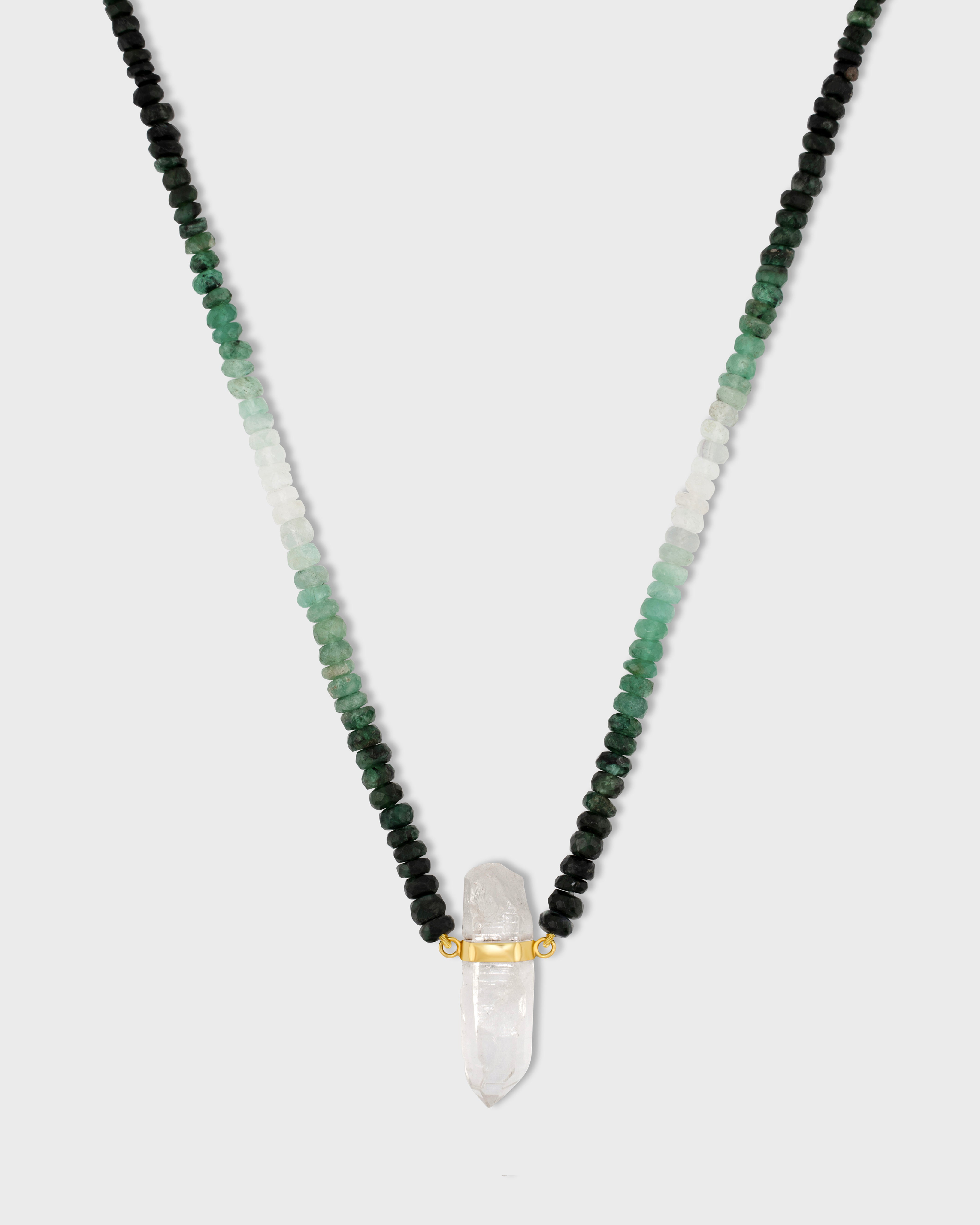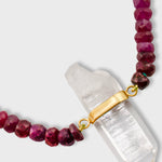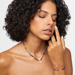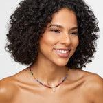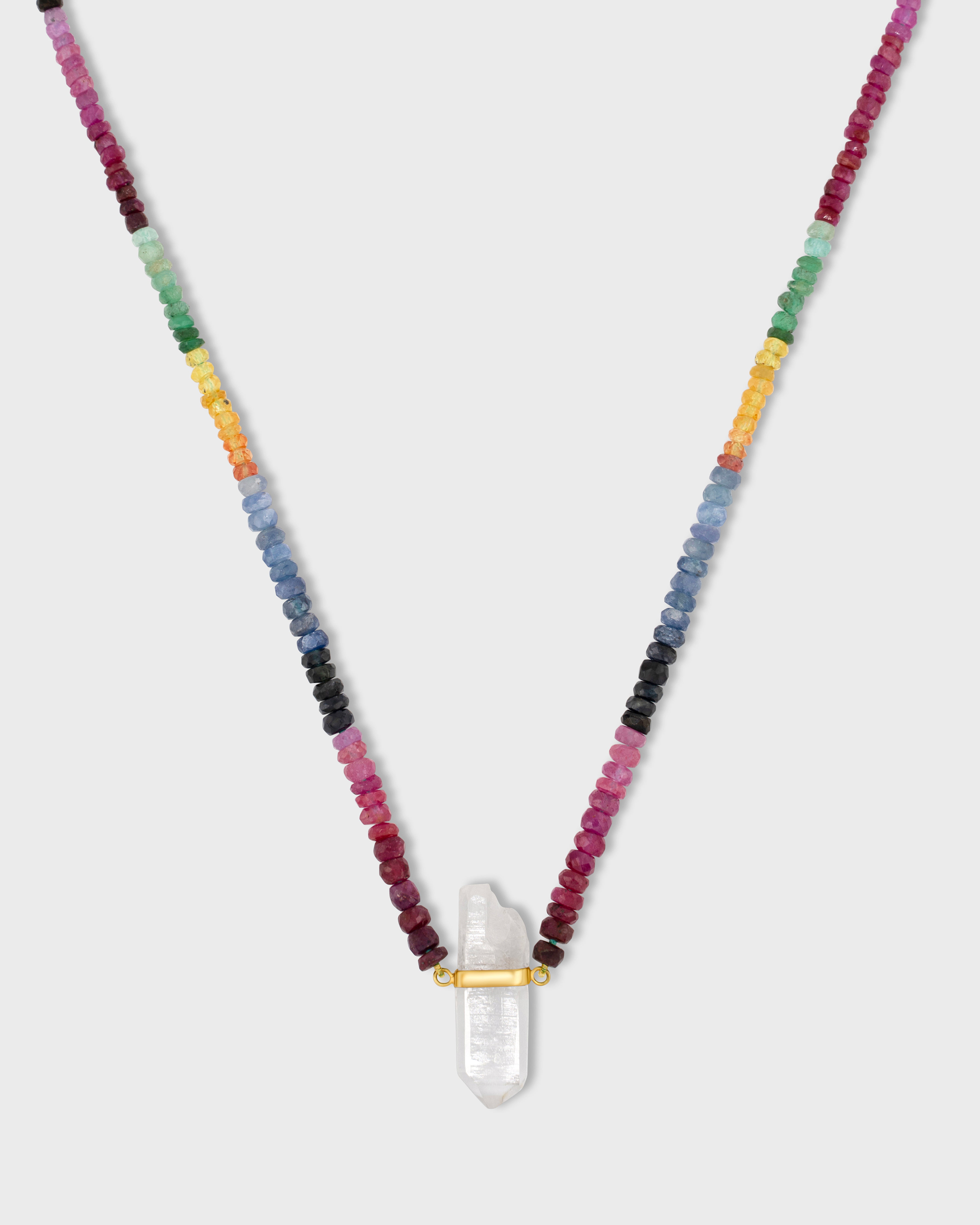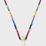 Inspired by the Arizona desert, this necklace combines dark rainbow sapphires with crystal quartz and a gold bar. The piece is a perfect balance of earthy hues and celestial elegance, symbolizing strength and transformation.