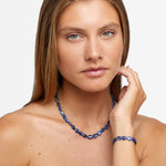 This striking bracelet features a strand of large, oval-shaped Kyanite gemstones, each one showcasing the stone's deep blue hue. The gemstones are strung together with 14k gold-filled wire, creating a bold and eye-catching piece.
