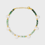 This elegant bracelet features a gradient of green emeralds, ranging from deep green to light green. The gemstones are interspersed with lustrous pearls and gold-filled beads, creating a luxurious and sophisticated piece.