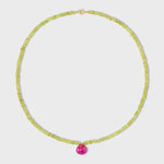 This simple yet elegant necklace features a delicate chain adorned with small, round green stones. The uniform pattern of the stones creates a calming and sophisticated look.