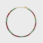 All natural ruby, tigers eye, and emerald hand strung in the heart of New York City and finished with 14 karat yellow gold.