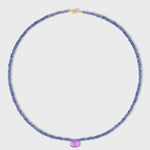 A luminous violet heart pendant rests at the center of a strand of ombré tanzanite rondelles, symbolizing transformation, clarity, and spiritual connection. Perfect for adding an elegant, soulful touch to any look.
