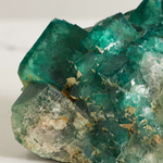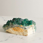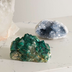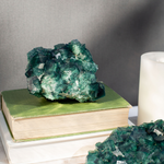 This Green Fluorite Cluster features cube-like crystals in a deep, calming shade of green. Known for its healing properties, it enhances focus, emotional balance, and serenity. Perfect as a decorative piece or for meditation, it brings tranquility and captivating beauty to any space. Use it as a paperweight or to cast captivating shadows when placed by a window.