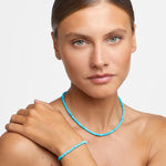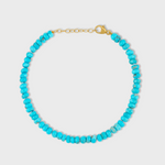 Beautiful turquoise hand strung with silk in New York City, finished with 14 karat gold hardware.