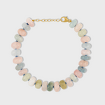 Multicolored morganite crystal bracelet hand strung and finished in 14 karat gold.