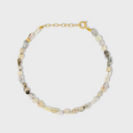Iridescent white opal pebbles hand strung in the heart of New York City and finished with 14 karat yellow gold.
