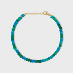 Vibrant green and blue opals hand strung in New York City and finished with 14 karat yellow gold.