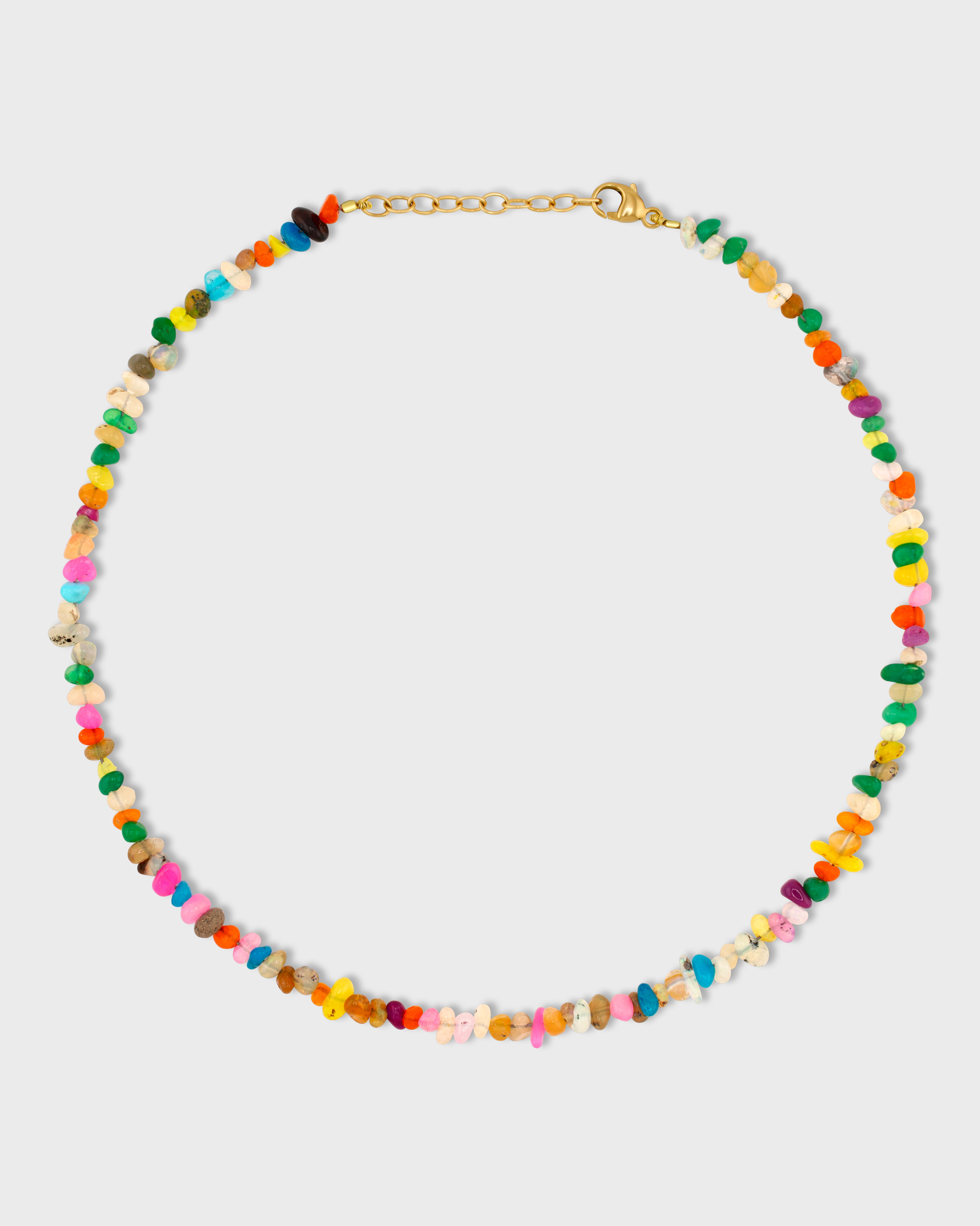 Bright rainbow pebble opals hand strung in the heart of New York City and finished with 14 karat yellow gold.