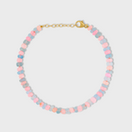 Bubblegum pink & sky blue opals hand strung in New York City and finished with 14 karat yellow gold.