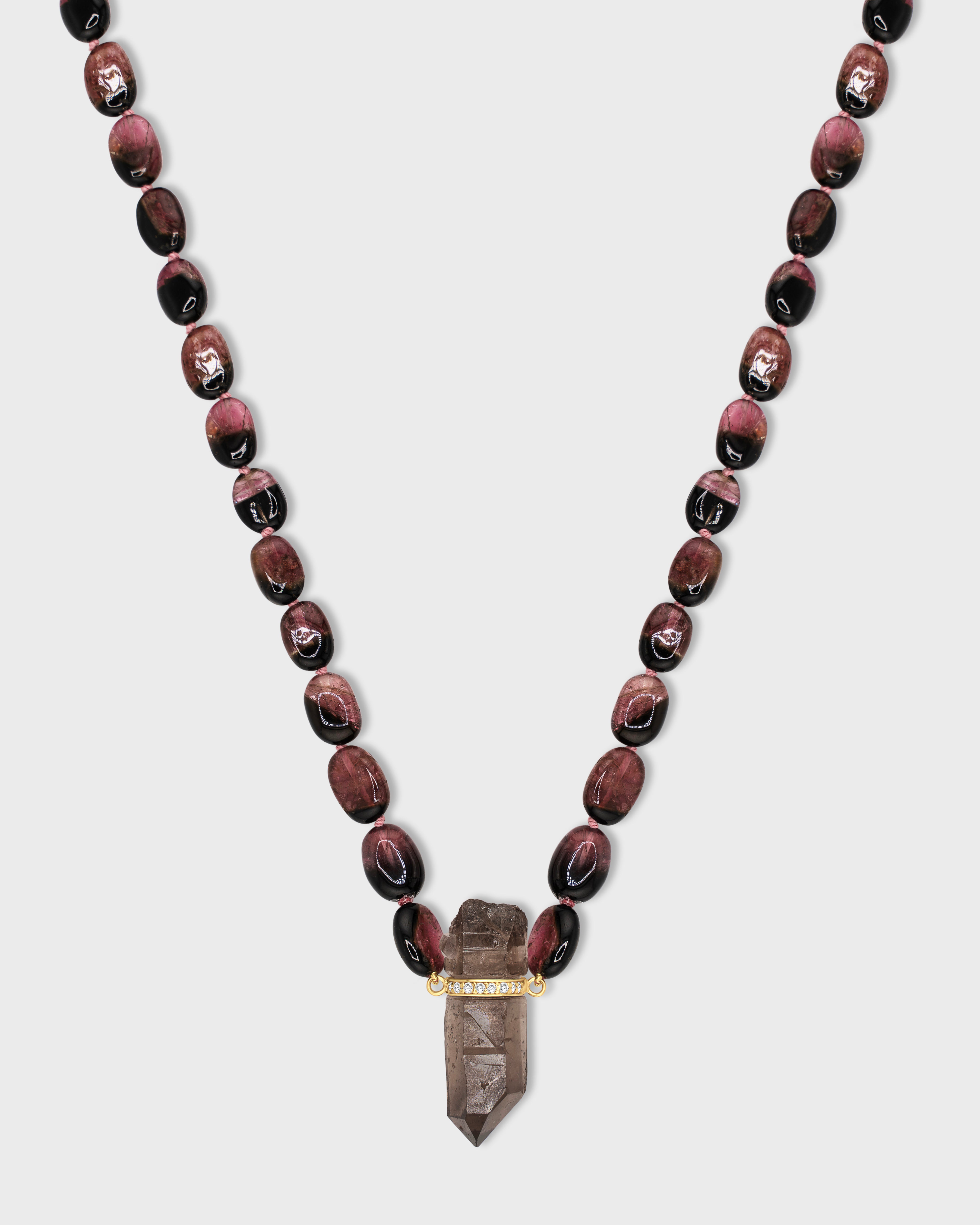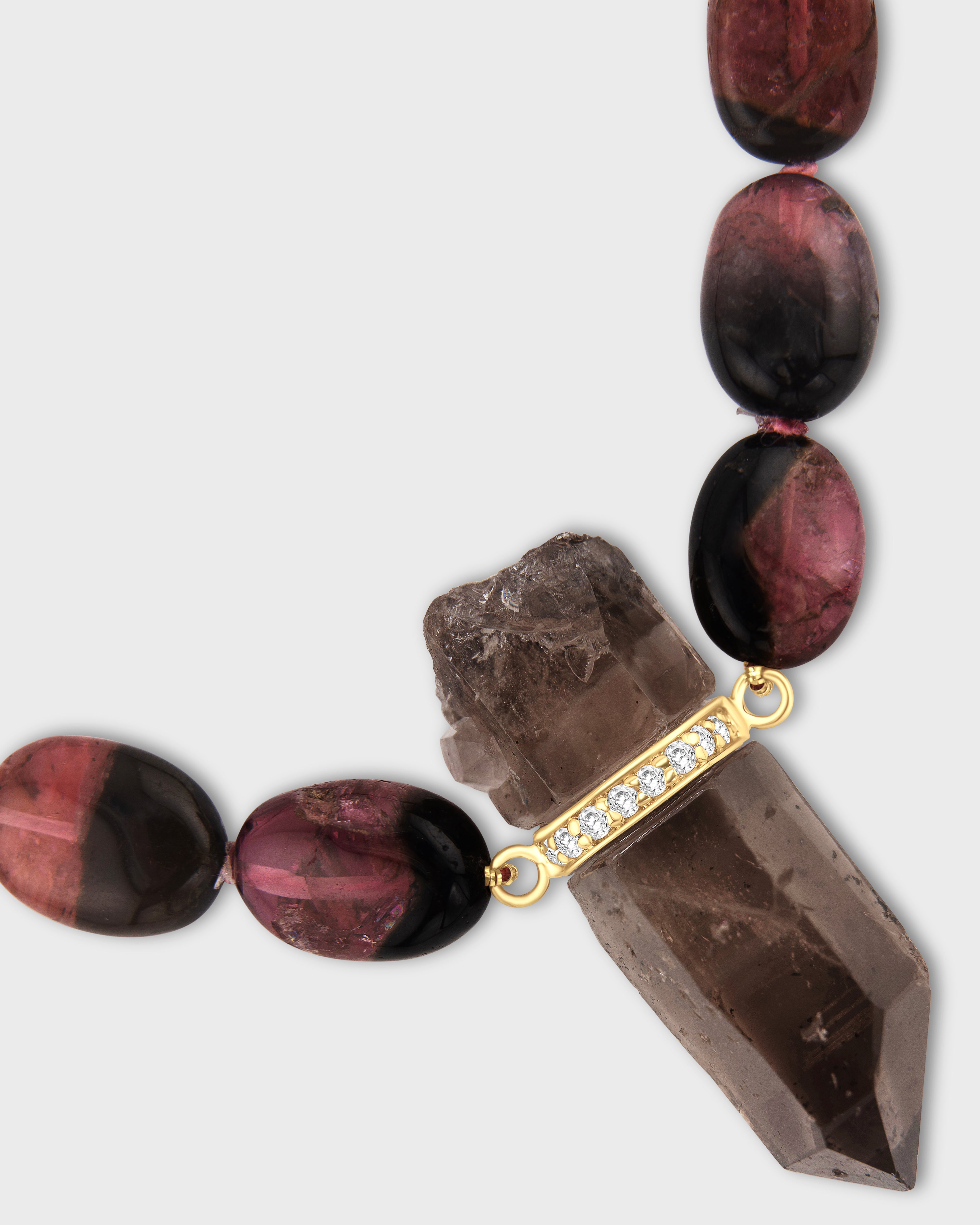 Hand-knotted bio tourmaline beads meet a striking smoky quartz point set with a diamond bar, creating a grounding, statement-making piece infused with natural beauty. A powerful everyday talisman handcrafted with intention in 14k gold.