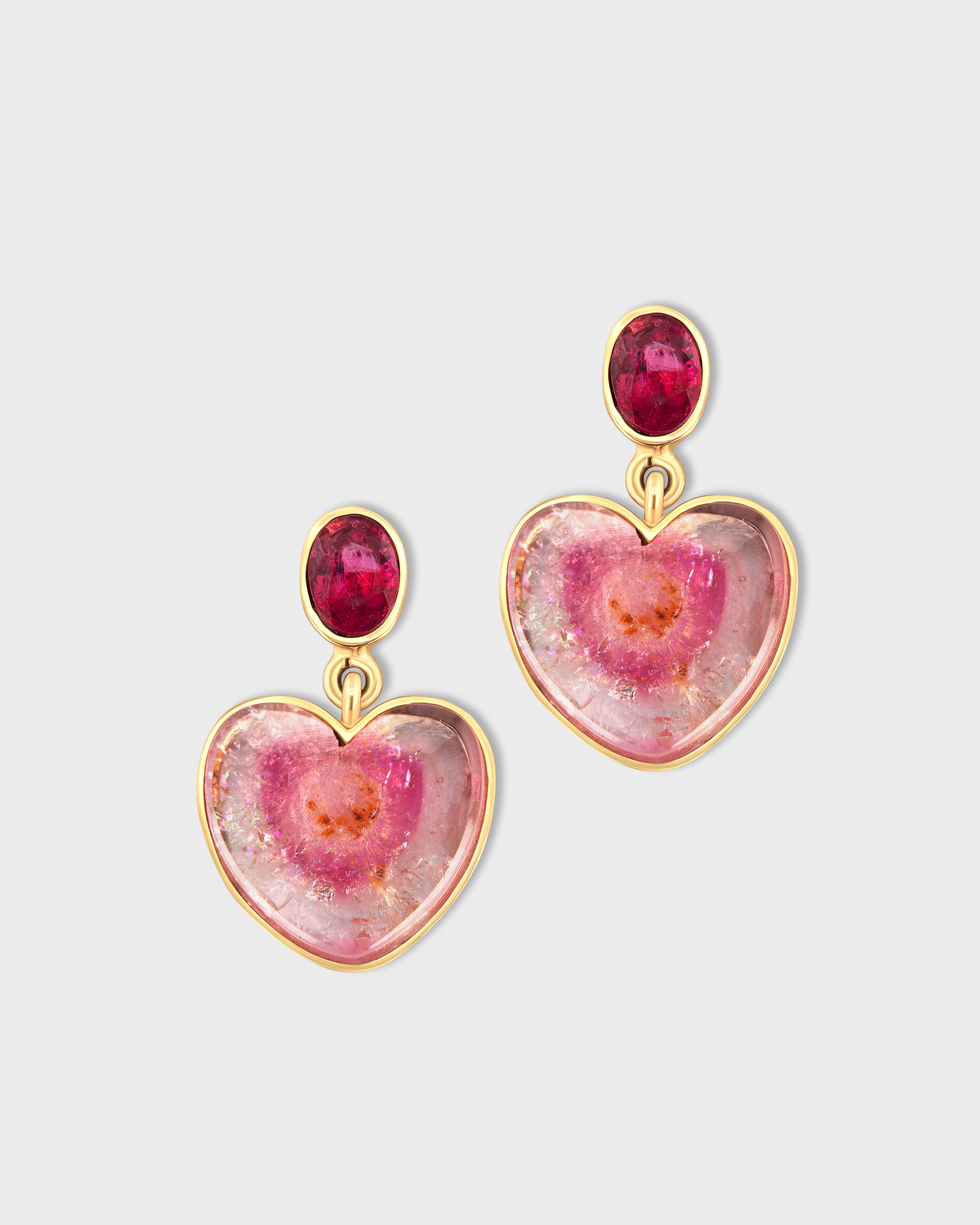 Watermelon tourmaline heart slices glow with natural, vivid color, topped with radiant ruby studs and framed in 14K gold for a bold, love-filled statement.