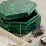 This meticulously crafted Malachite Hexagon Jewelry Box features the vibrant green bands and mesmerizing patterns of polished malachite. Known for its protective and transformative properties, it’s perfect for storing your favorite jewelry while adding a touch of elegance to any vanity. A striking and functional piece, it brings both beauty and energy to your space.