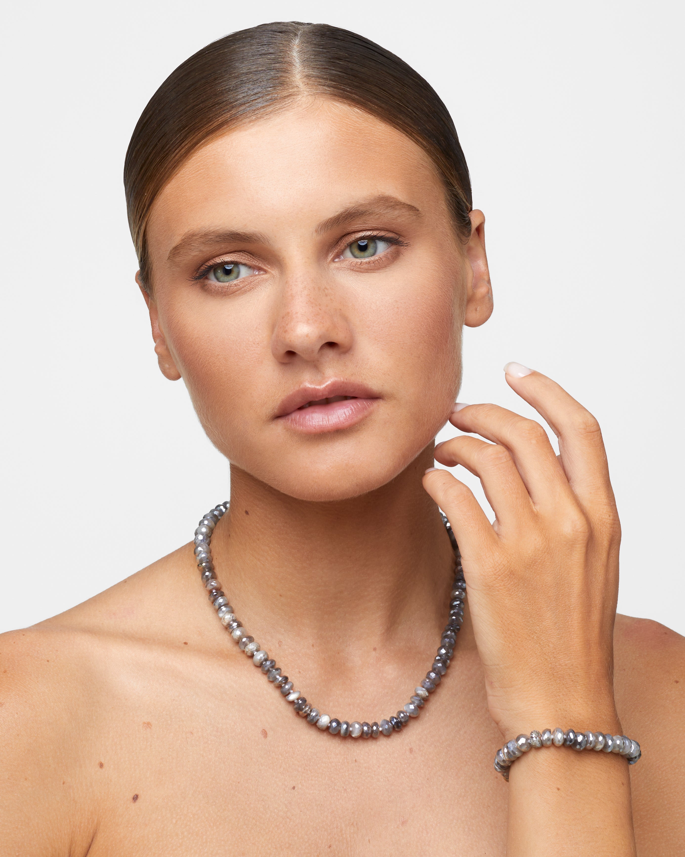 The mystic sheen of labradorite beads in soft blues and grays gives this bracelet an ethereal, transformative quality. It is believed to enhance intuition and protect the wearer, making it a powerful piece for those seeking guidance.