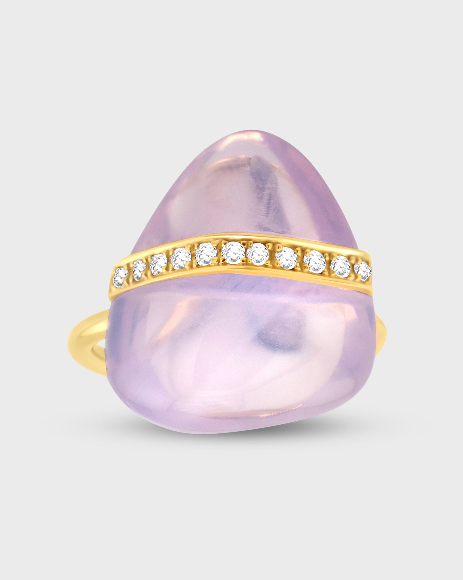 A rare milky translucent lavender purple crystal. Colors and shapes are all natural and untreated. Custom hand set in 14 karat gold and diamonds.