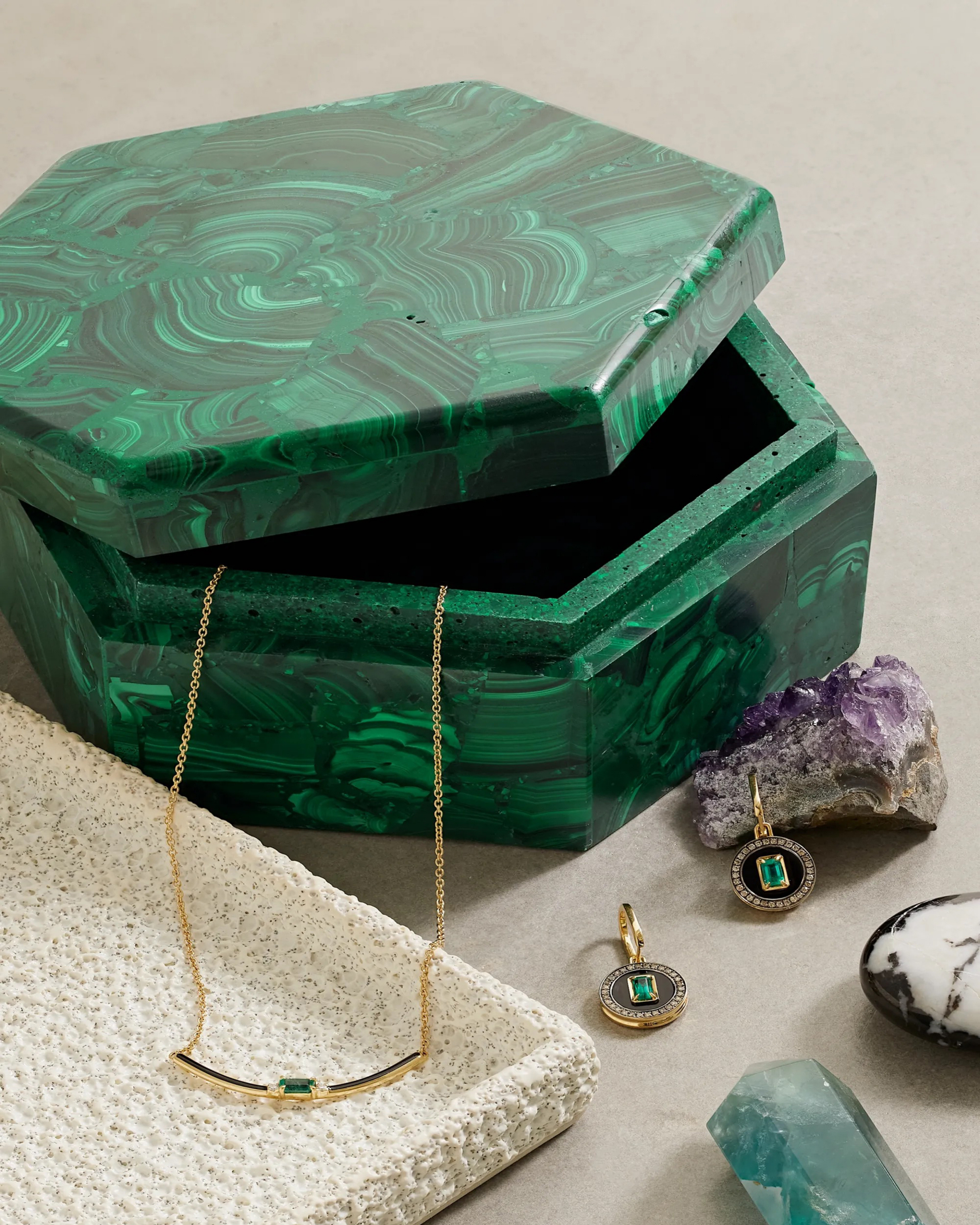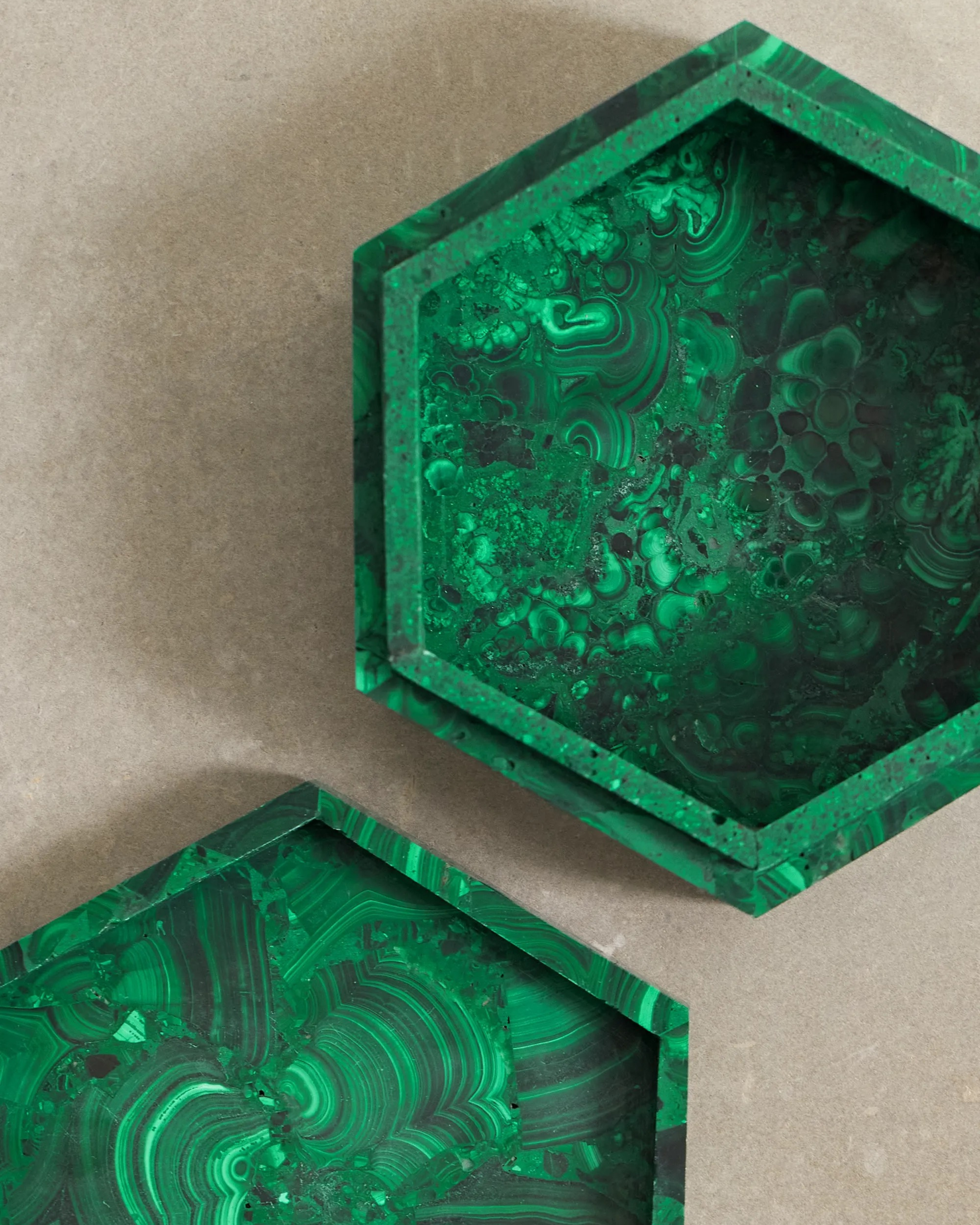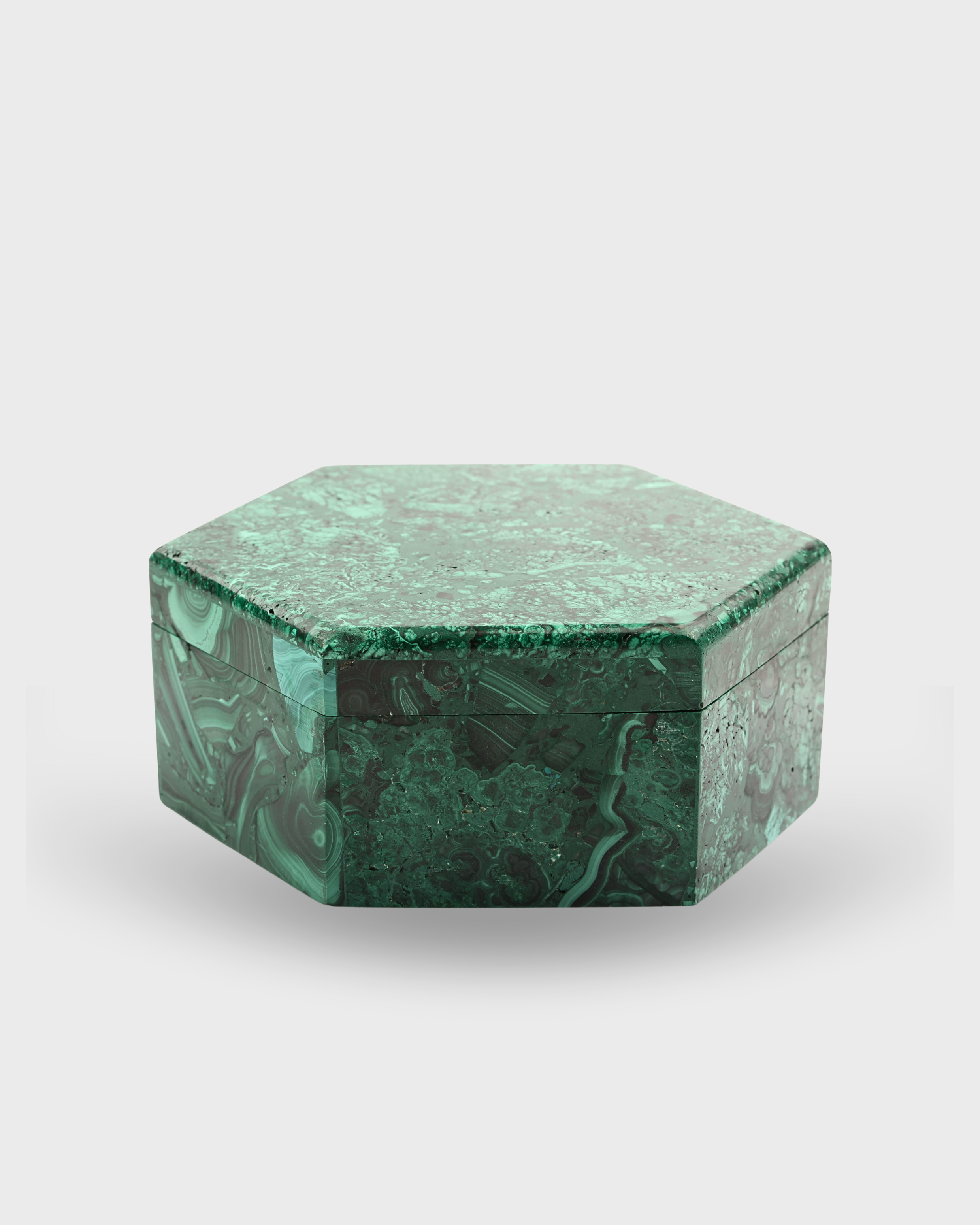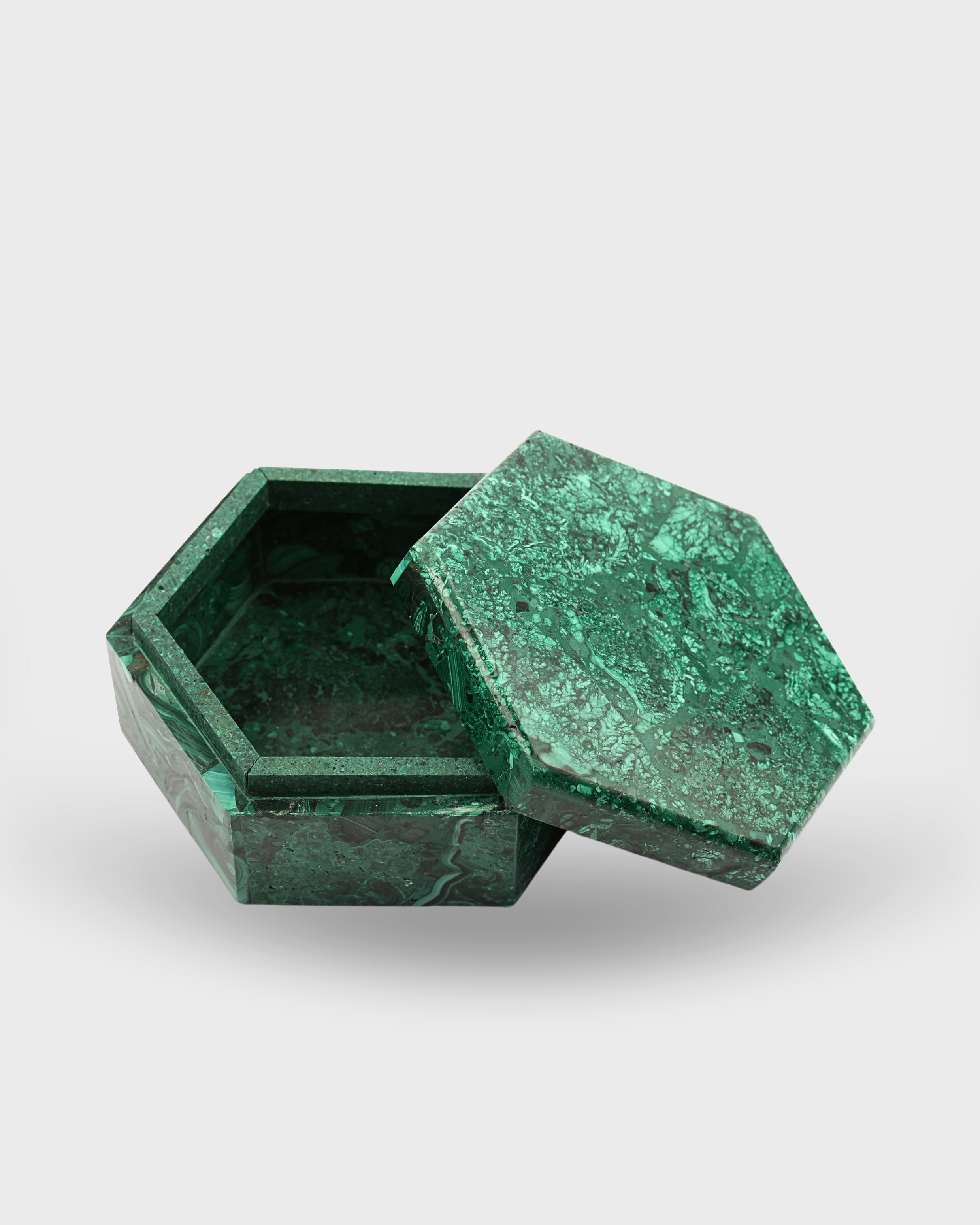This meticulously crafted Malachite Hexagon Jewelry Box features the vibrant green bands and mesmerizing patterns of polished malachite. Known for its protective and transformative properties, it’s perfect for storing your favorite jewelry while adding a touch of elegance to any vanity. A striking and functional piece, it brings both beauty and energy to your space.