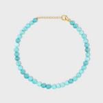 Vibrant blue turquoise and opal hand strung in New York City and finished with 14 karat yellow gold.