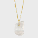 Crystal Quartz Tag Necklace created with rare crystal quartz in the shape of its own unique flat rectangular shape. It resembles a tag. We hand carved a circle at the top and hugged it with 14 karat gold, creating a sleek and beautiful finish that can be worn to our chain or your own.