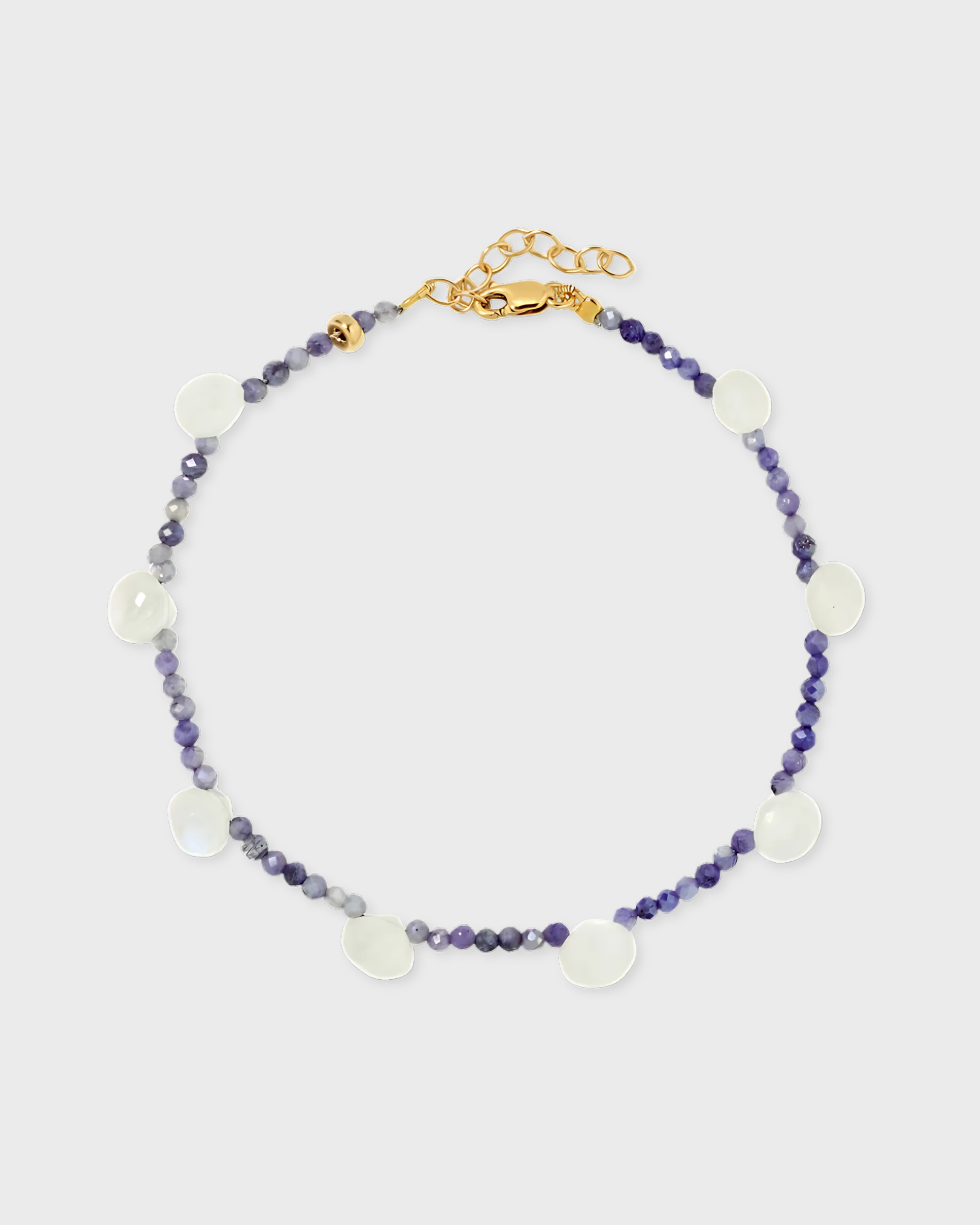 Lustrous silverite is accented by shimmering rainbow moonstone drops, creating an ethereal and celestial design. This bracelet is perfect for those who love a touch of magic and elegance in their accessories.