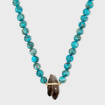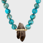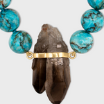 This necklace features turquoise sphere beads paired with a unique smoky quartz charm in the center. The turquoise beads have a marbled, natural look with shades of blue and green, while the central charm is composed of raw smoky quartz crystals bound together with a gold-colored band.