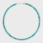Beautiful Kingman turquoise hand strung with silk in New York City, finished with 14 karat gold hardware.