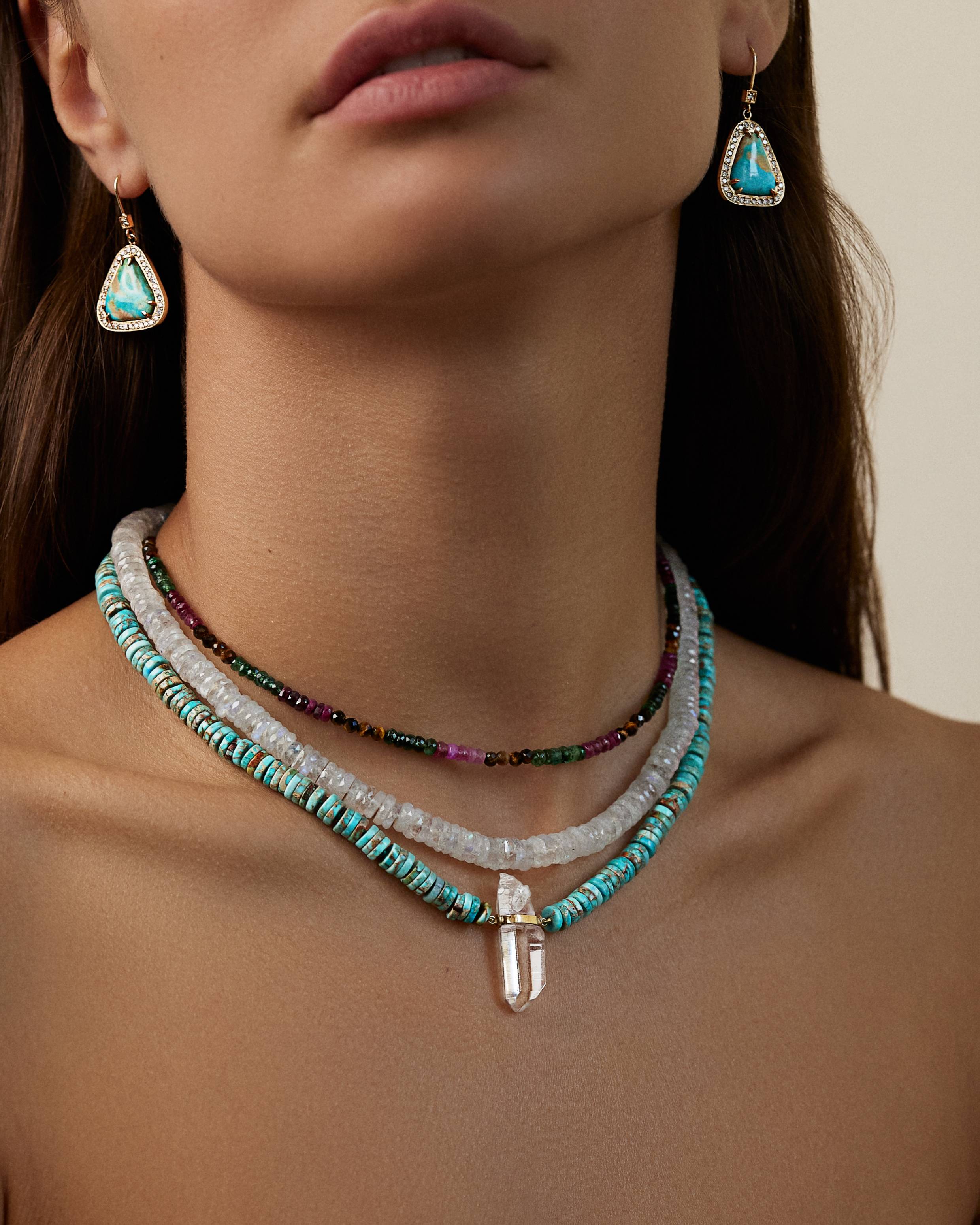 Each beaded jewelry piece is hand strung from the highest quality materials that are cut from natural mineral sources. They are sensitive to prolonged exposure to hairsprays and scents. To ensure longevity please be gentle and avoid tugging and pulling of these pieces.