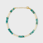Vibrant blue turquoise and opal hand strung in New York City and finished with 14 karat yellow gold.