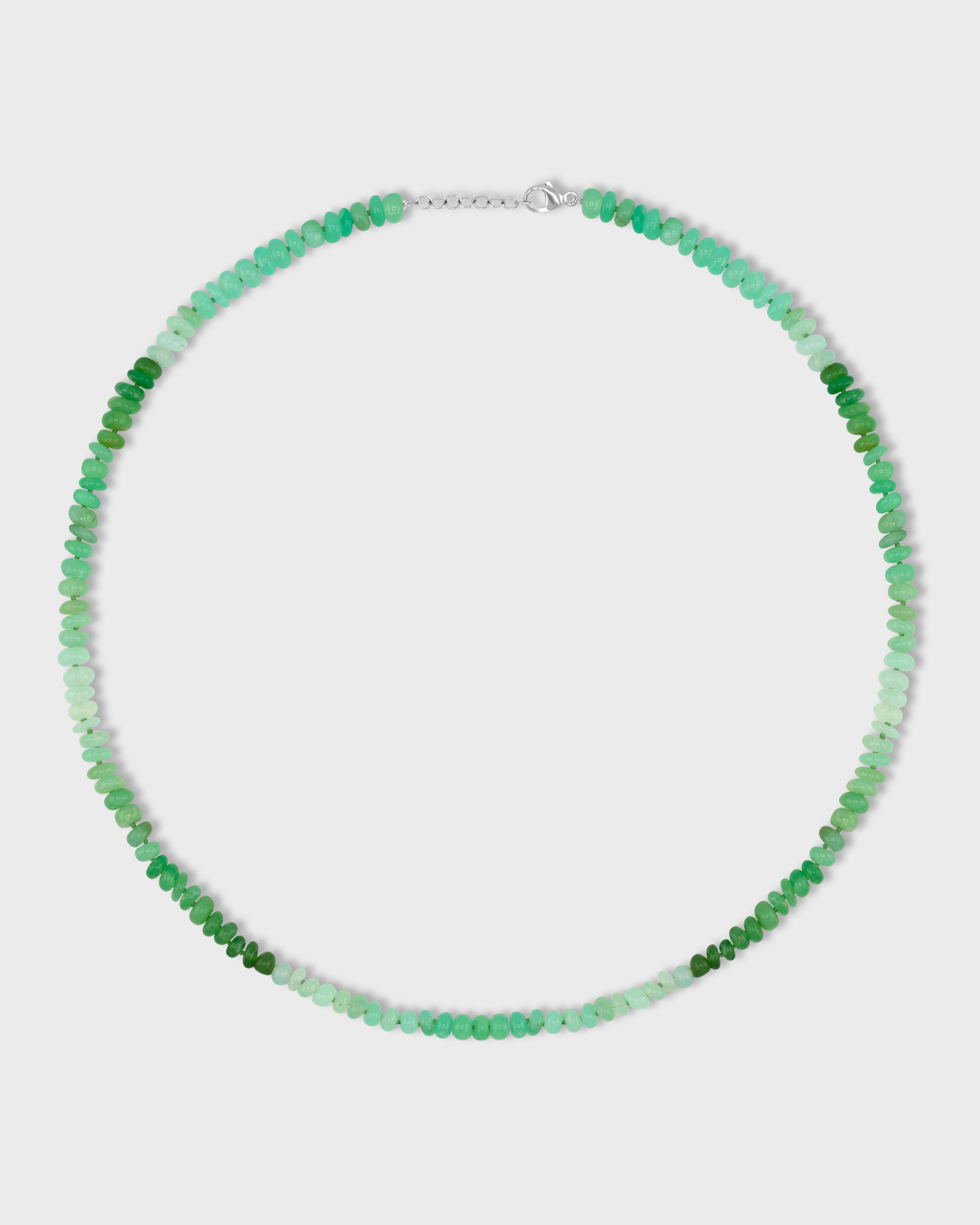 The Arizona Chrysoprase Ombre Necklace features smooth, rondelle-shaped chrysoprase beads that gradually shift in color from light to dark green. This ombre effect creates a stunning visual transition, showcasing the natural beauty and vibrancy of chrysoprase, making it a perfect addition to any jewelry collection.