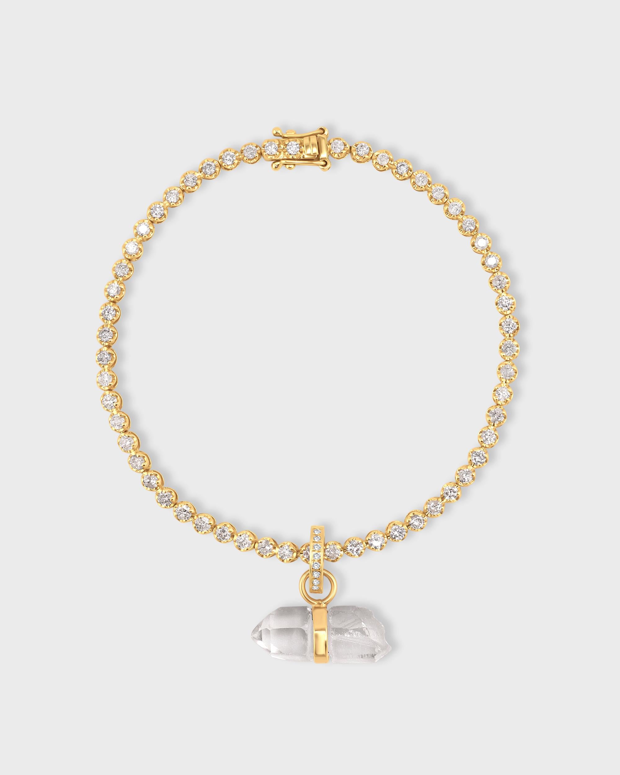This Crystalline Yellow Gold Diamond Crystal Quartz Bracelet features hand-set diamonds along a luminous yellow gold chain, centered by a raw Crystal Quartz charm wrapped in diamond detailing. Radiating clarity and strength, it blends natural elegance with refined luxury.