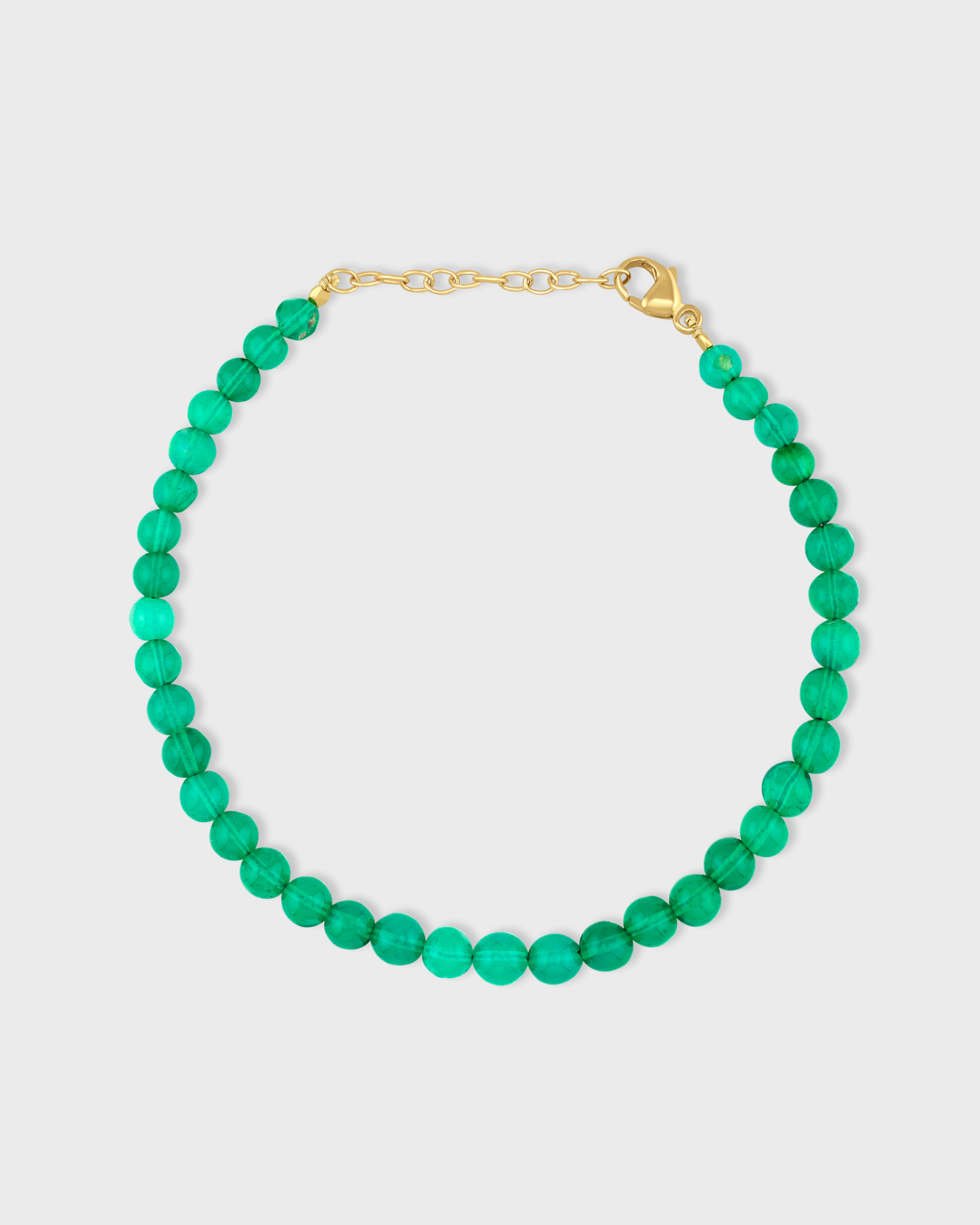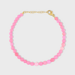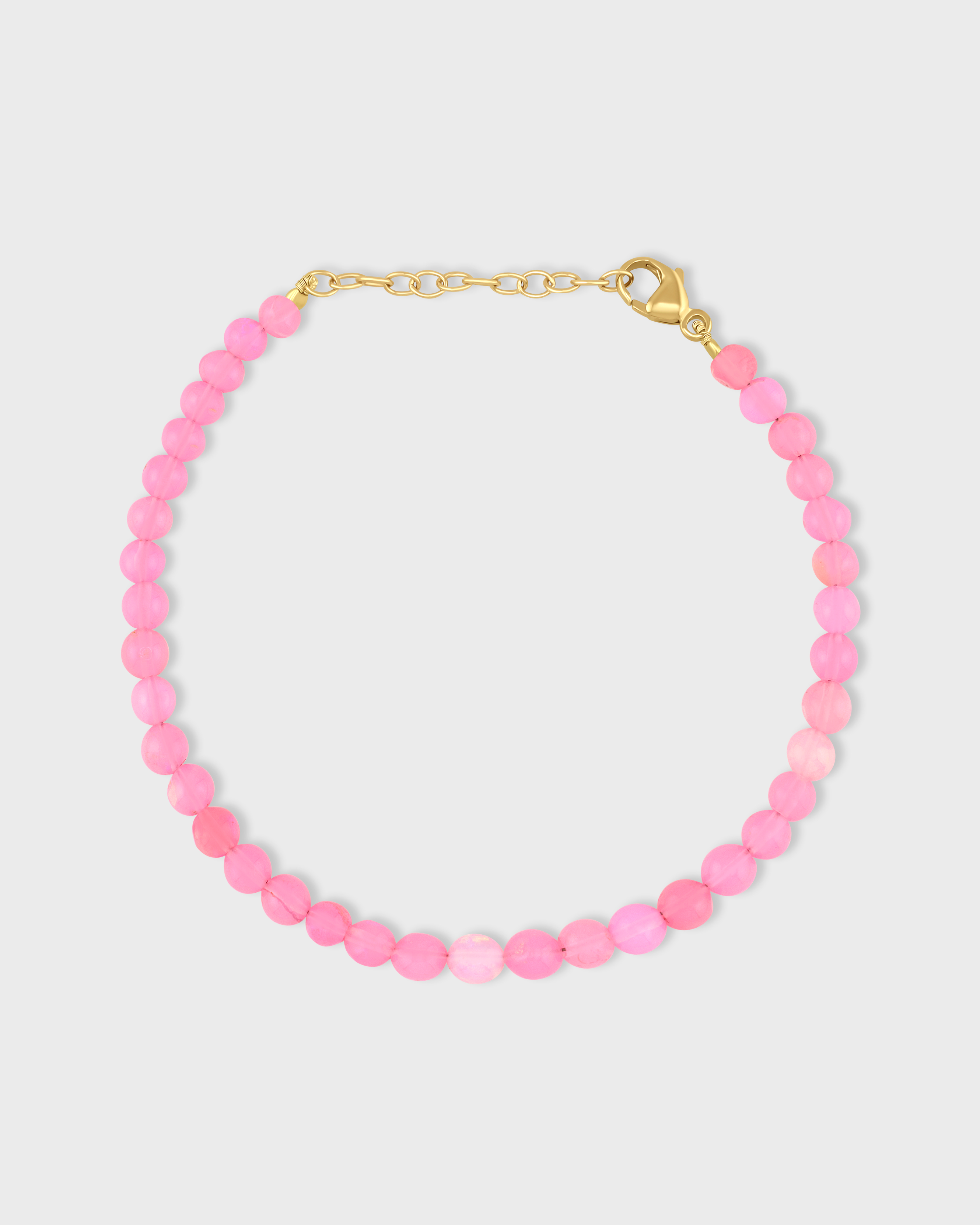Bright pink sphere opals bracelet hand strung in New York City and finished with 14 karat yellow gold.