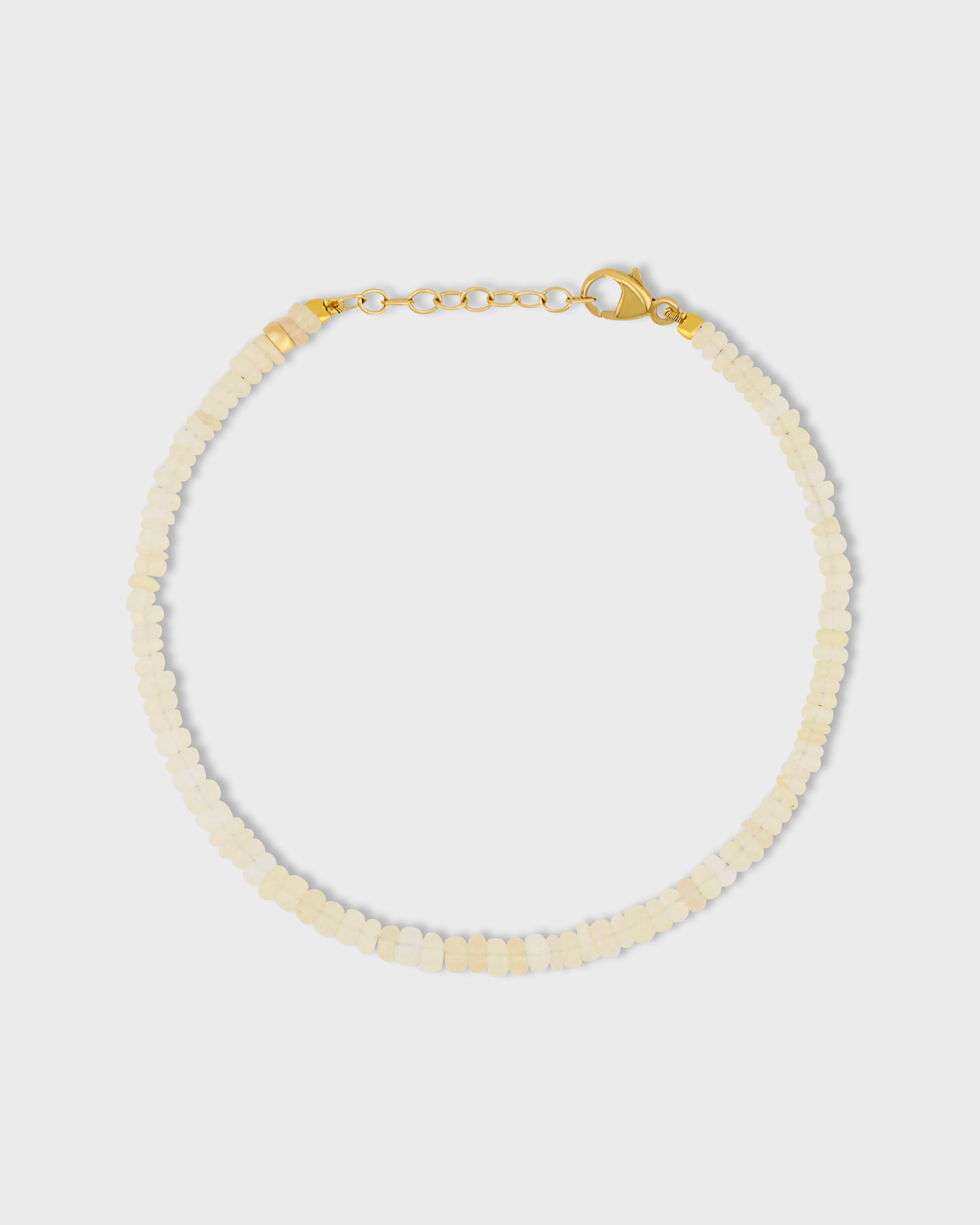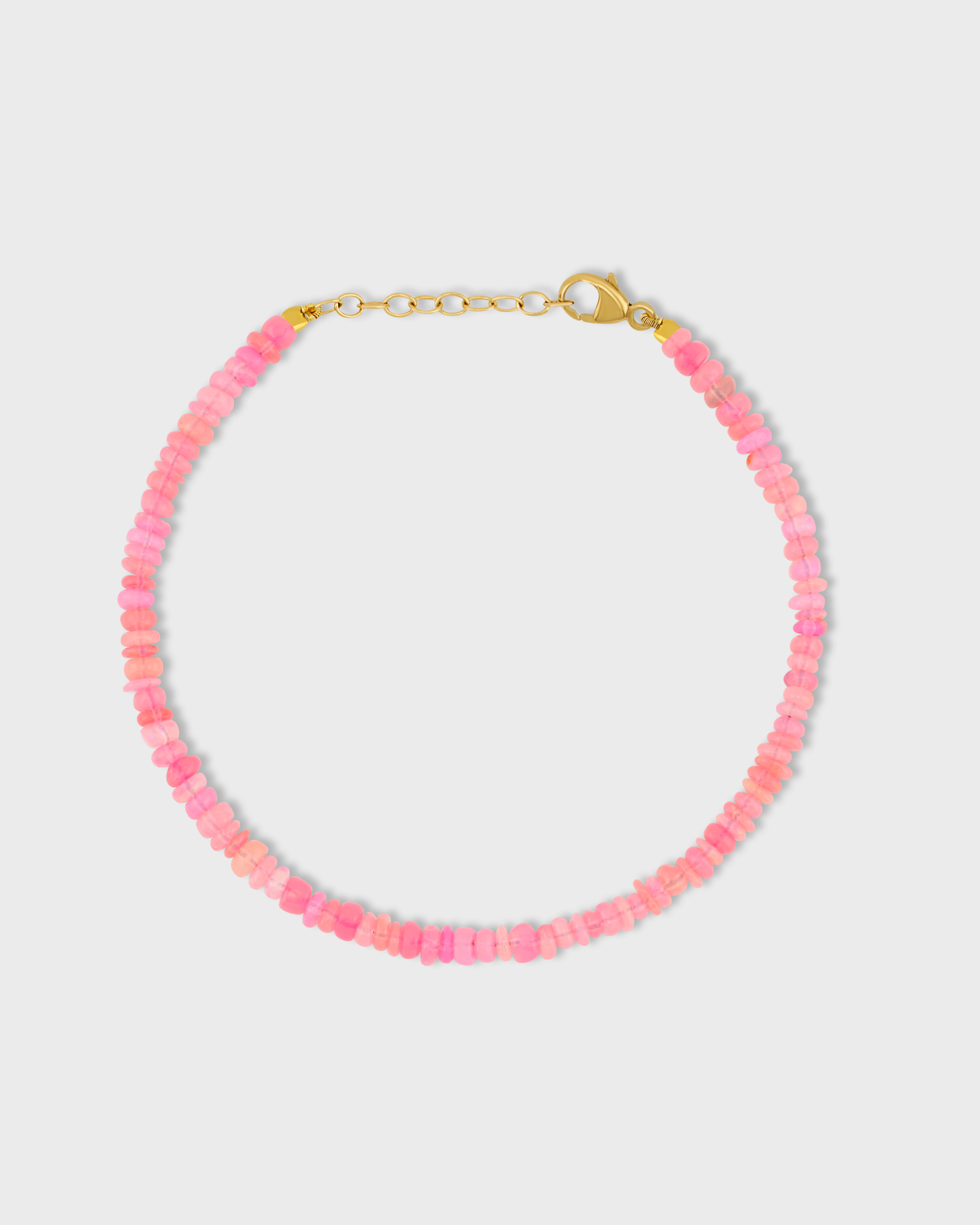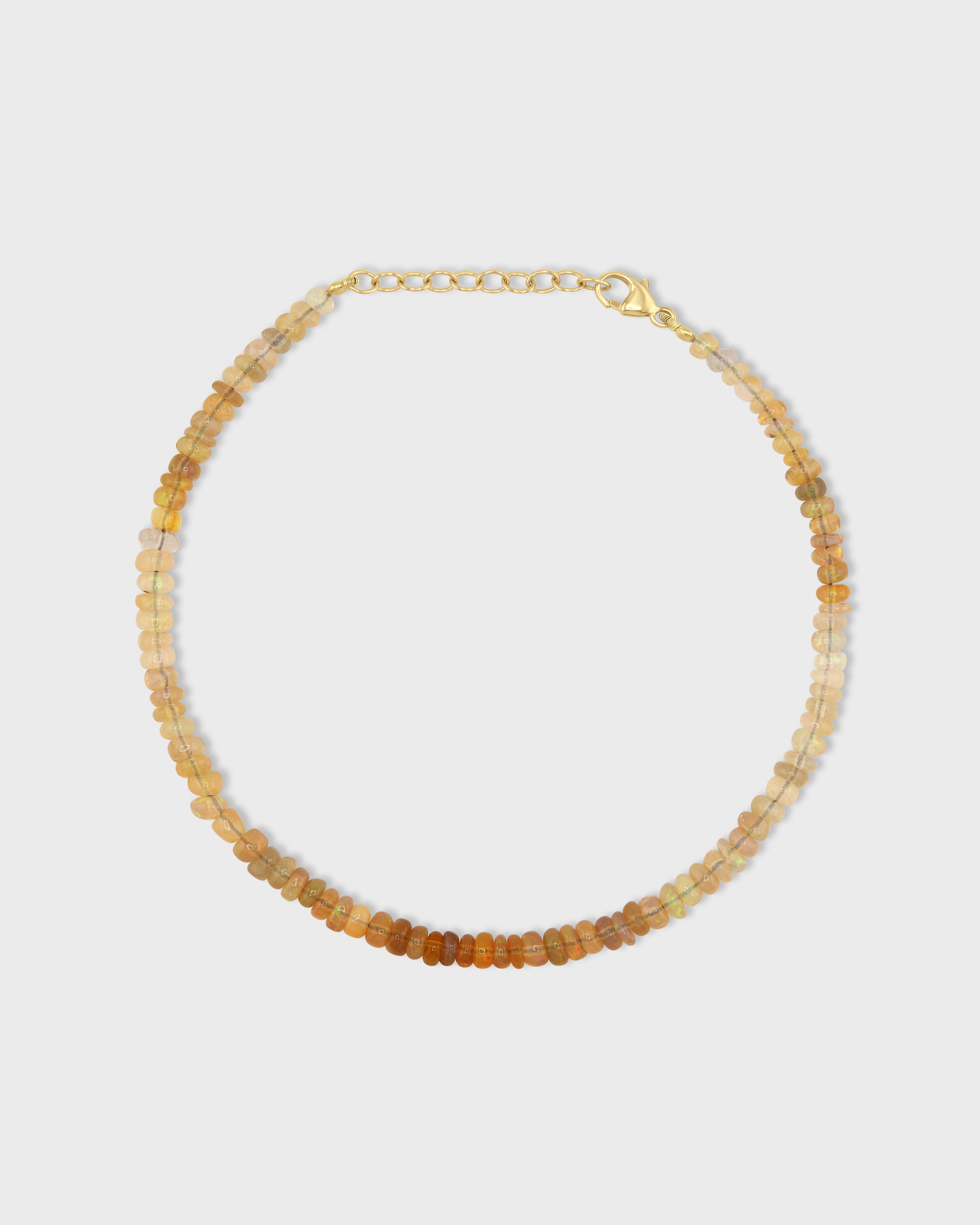 Bright violet opals hand strung in the heart of New York City and finished with 14 karat yellow gold.