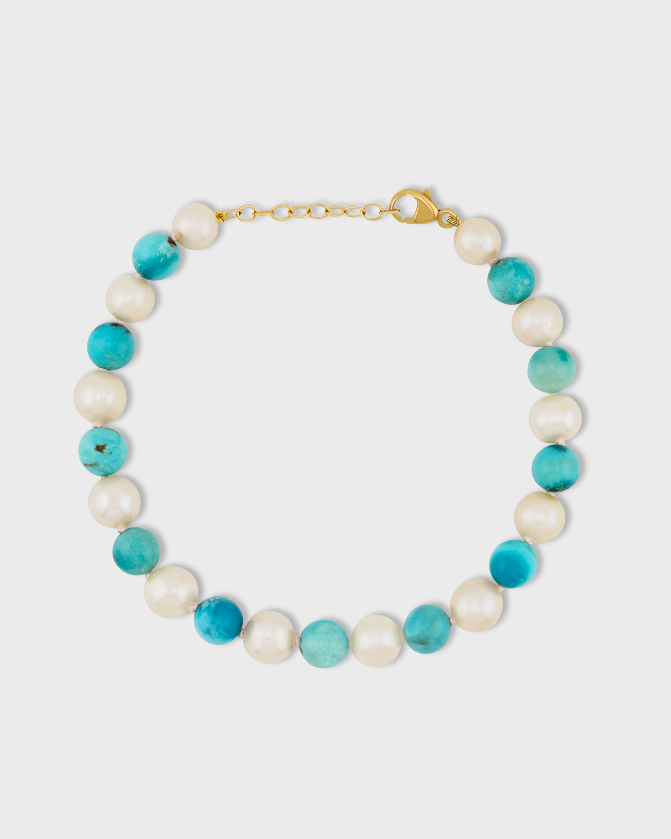 This elegant bracelet features lustrous white pearls paired with vibrant turquoise beads strung by hand in New York City on a 14k gold chain and clasp.