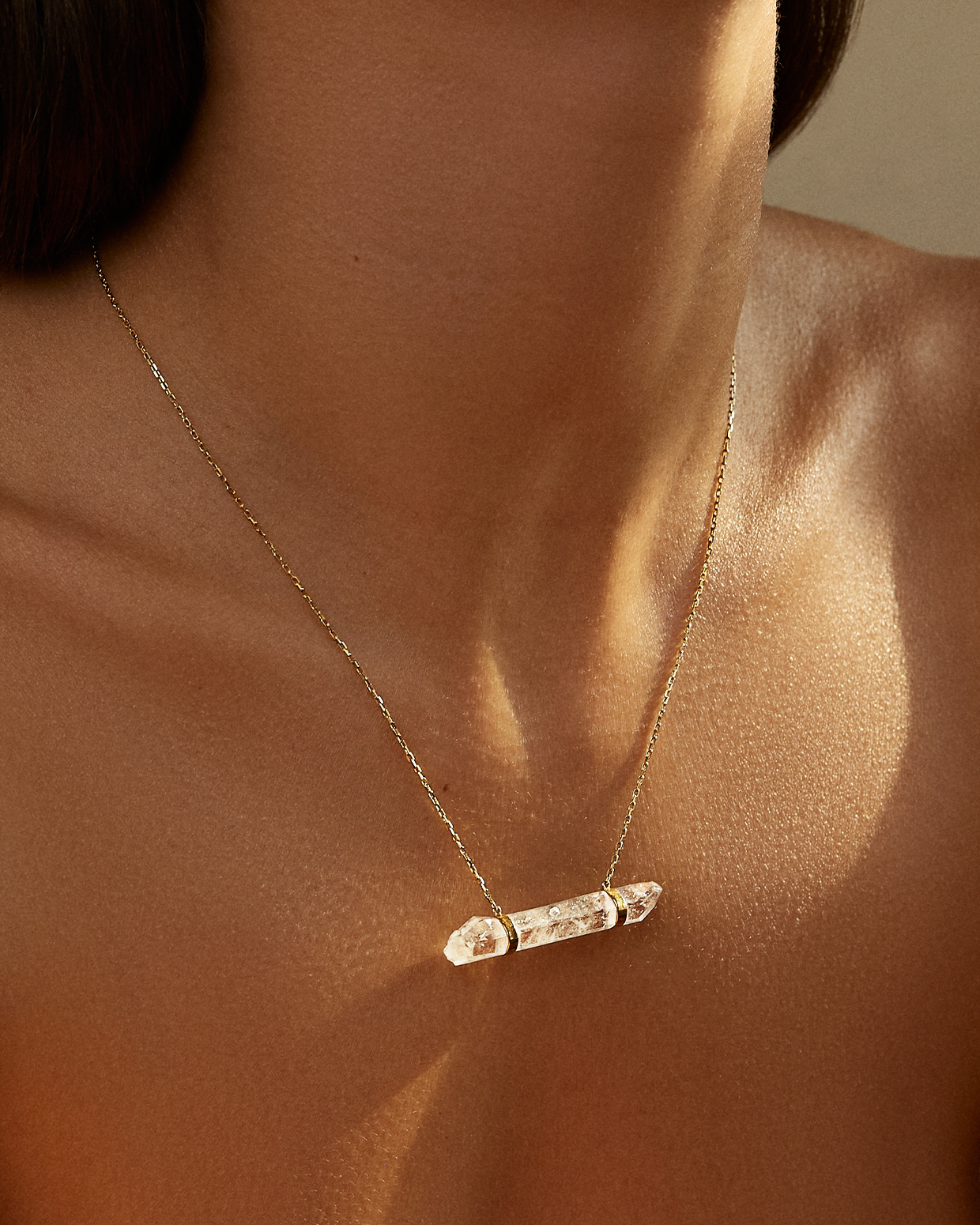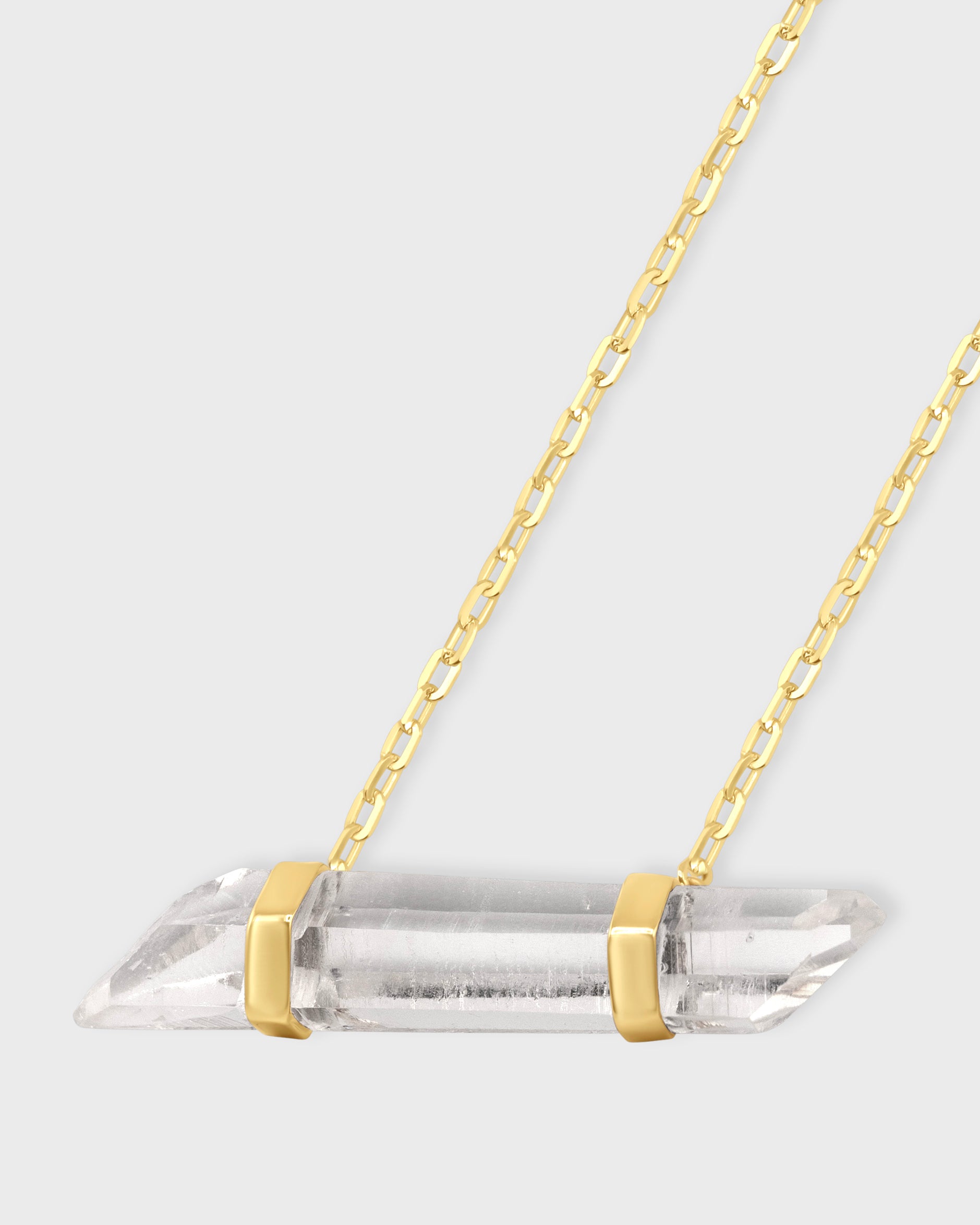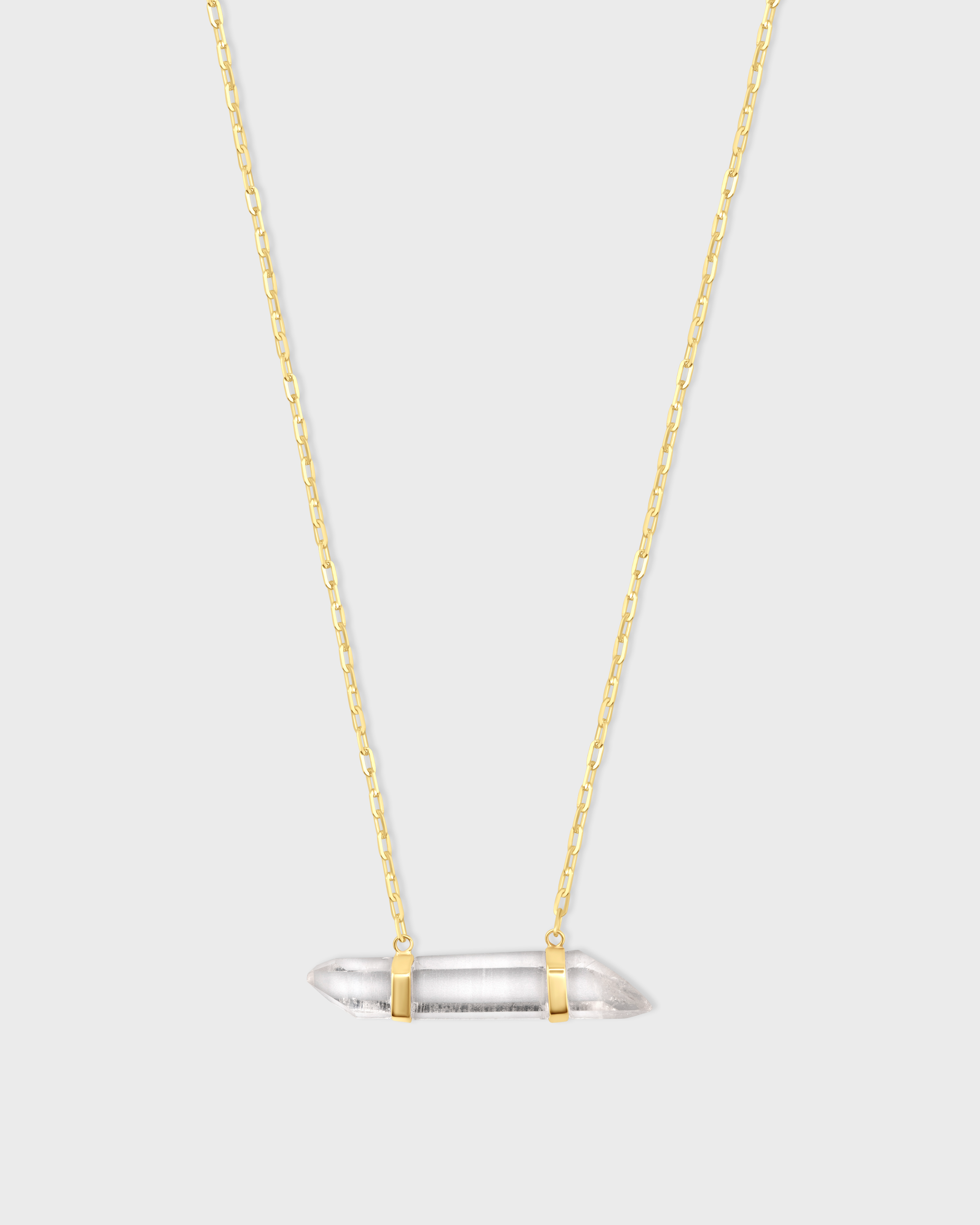 Crystal quartz suspended by two custom set gold bars on both sides. Master of all healing crystals, our clear crystal quartz is custom hand set to the natural shape of the stone in 14 karat yellow gold on Italian gold chain. Truly one of a kind piece, created to attune to the vibration of each individual wearer.