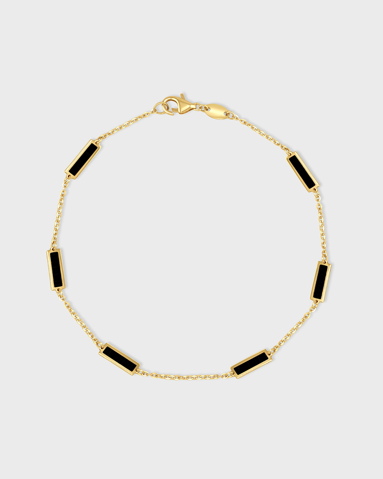This delicate piece showcases a 14k gold setting for lasting luxury, featuring rectangular black onyx inlays that adds a vibrant pop of color.
