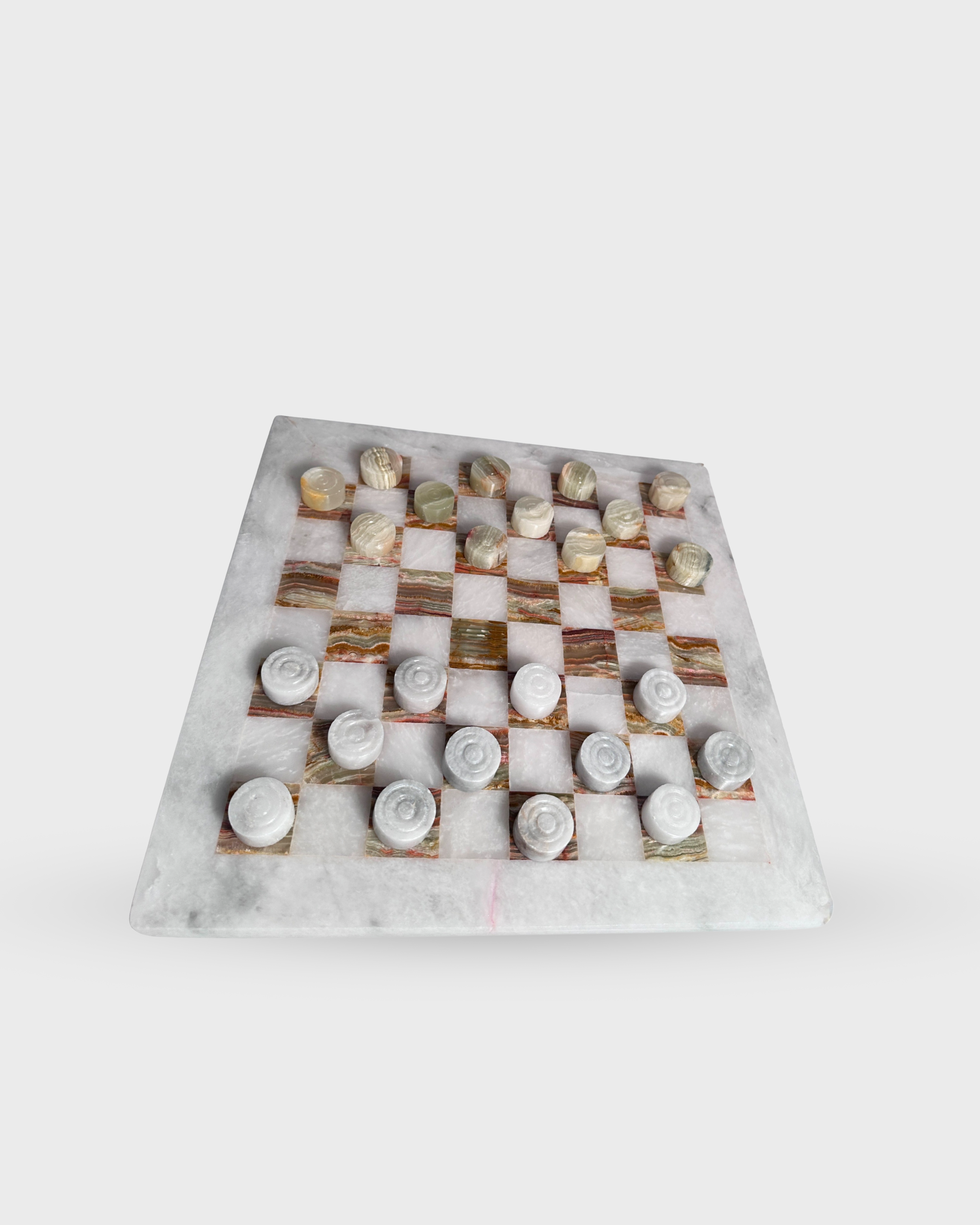 This checkers set contrasts warm brown and crisp white onyx, creating a refined and elegant aesthetic. Each piece is crafted to highlight the stone’s natural beauty, making it ideal for both play and display. A must-have for enthusiasts who appreciate unique materials.