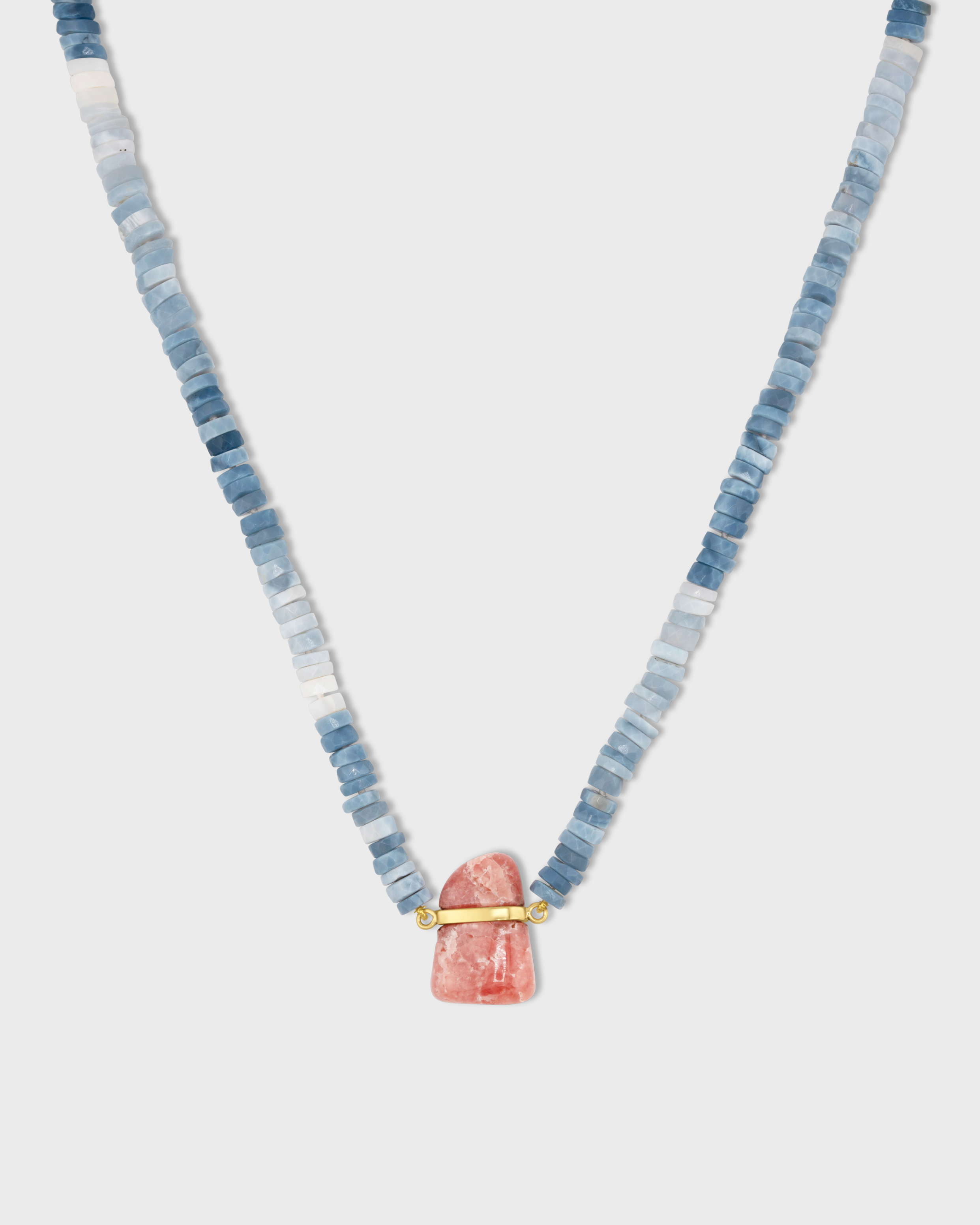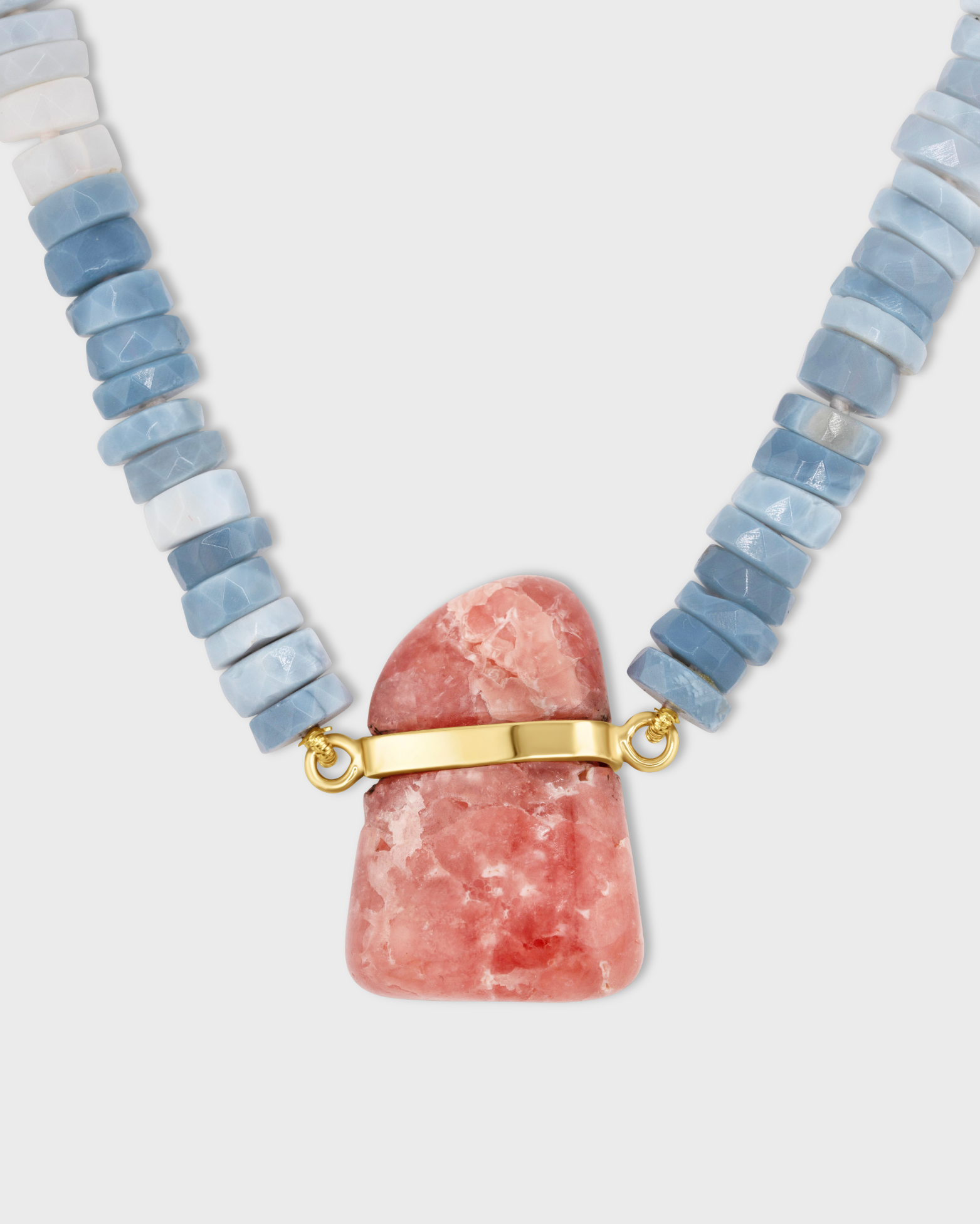 This necklace is a beautifully designed piece that features an ombré arrangement of blue opal beads that gradually shift in hue from deep to light blue. At its center is a distinctive rhodochrosite stone, with a gold bar accent that adds a luxurious touch. The combination of the warm pink tones of the rhodochrosite with the cool blues of the opal creates a striking and balanced contrast, making it an elegant and eye-catching accessory.
