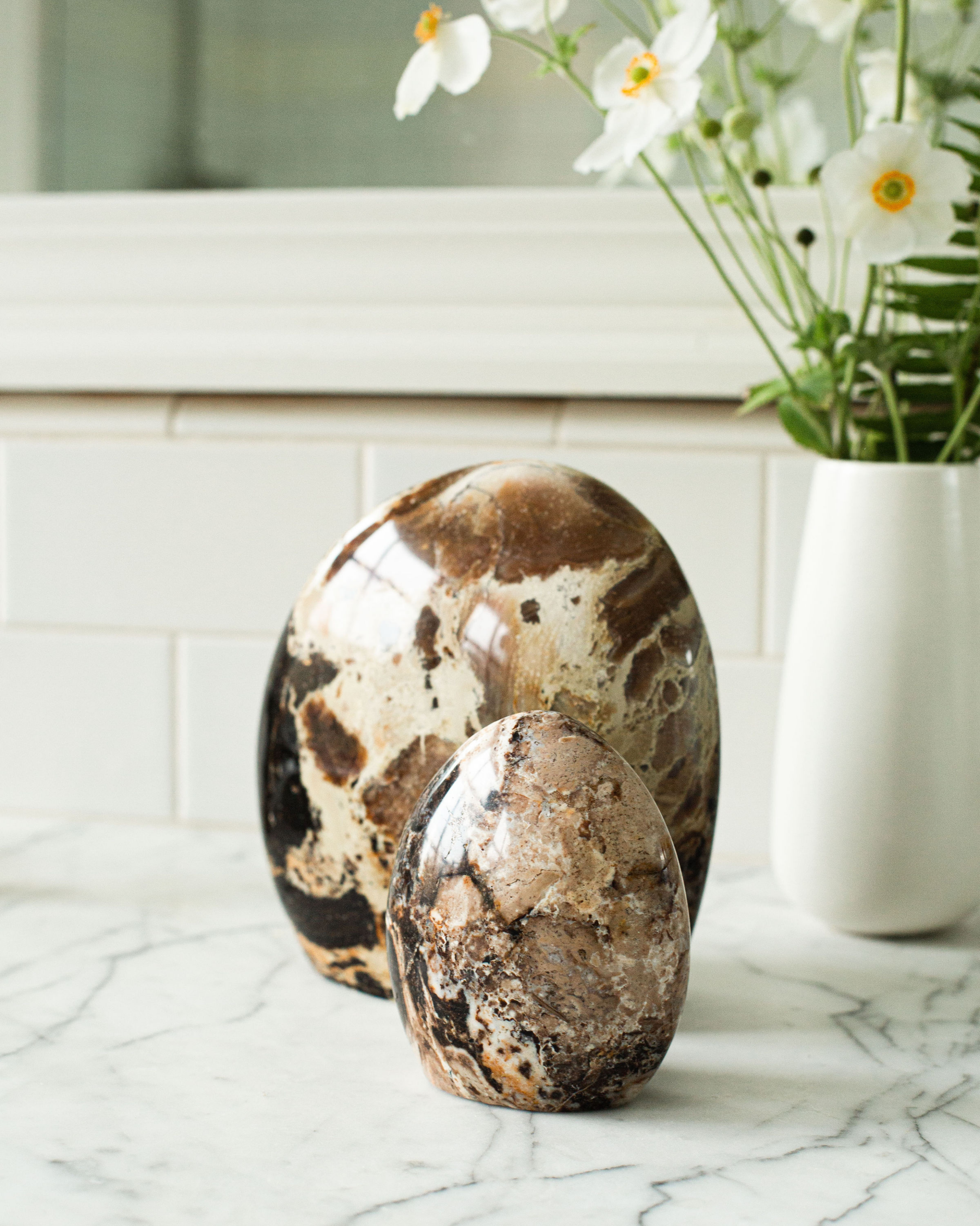Polished opal into a freeform dome shape. Perfect to pair back to multiples for a layered look in your home or on its own.