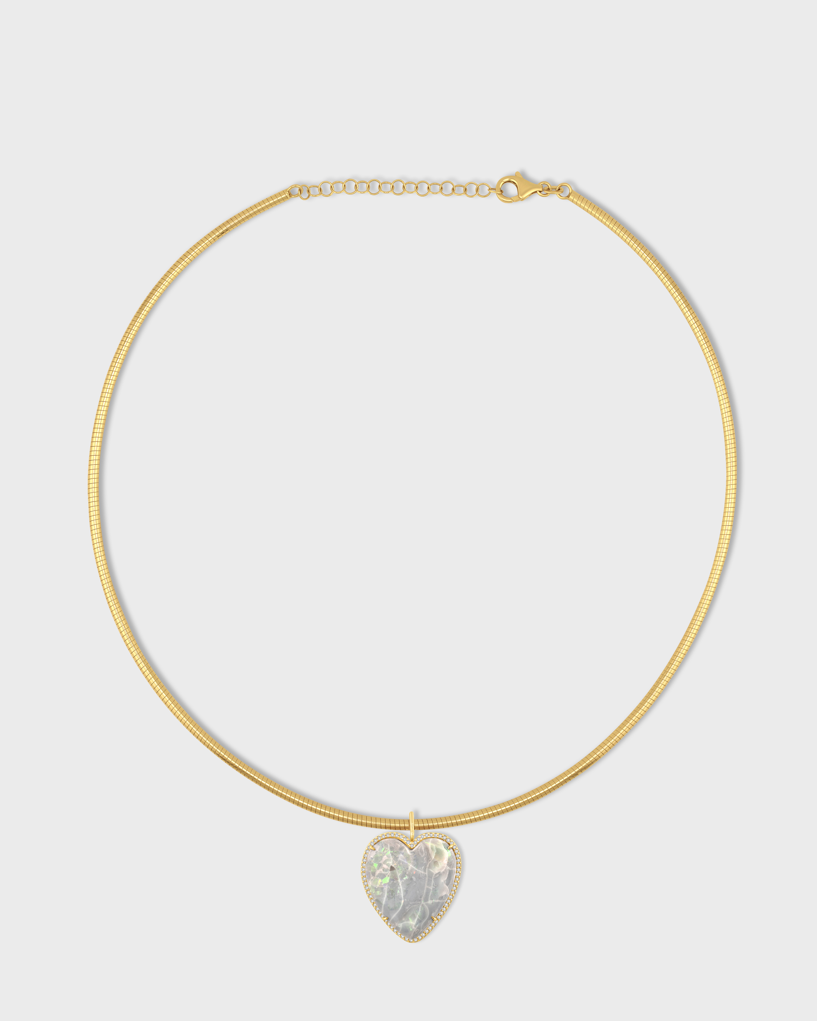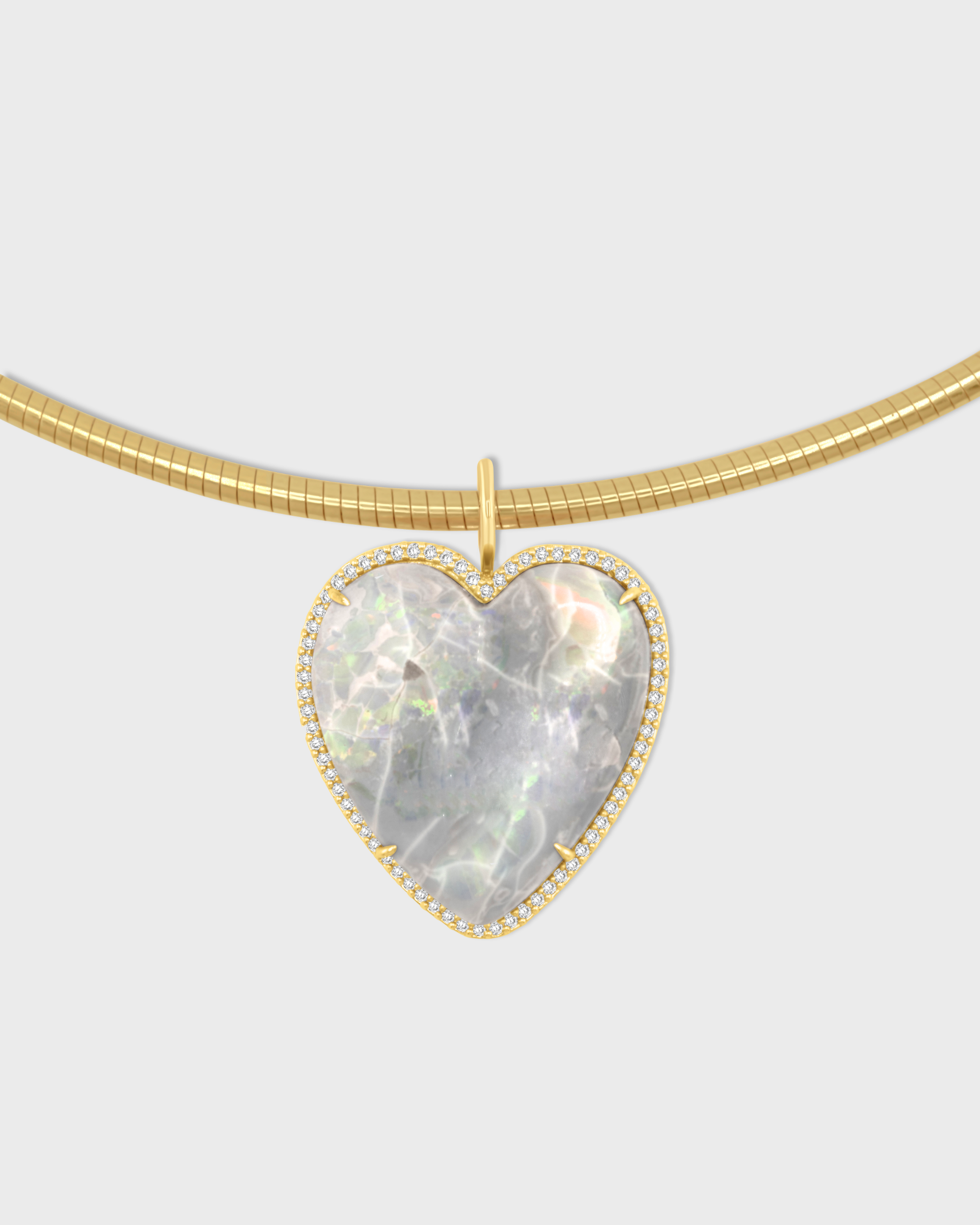This piece features a stunning heart-shaped opal framed by a sparkling diamond halo all set in 14k Gold. Handcrafted in NYC.