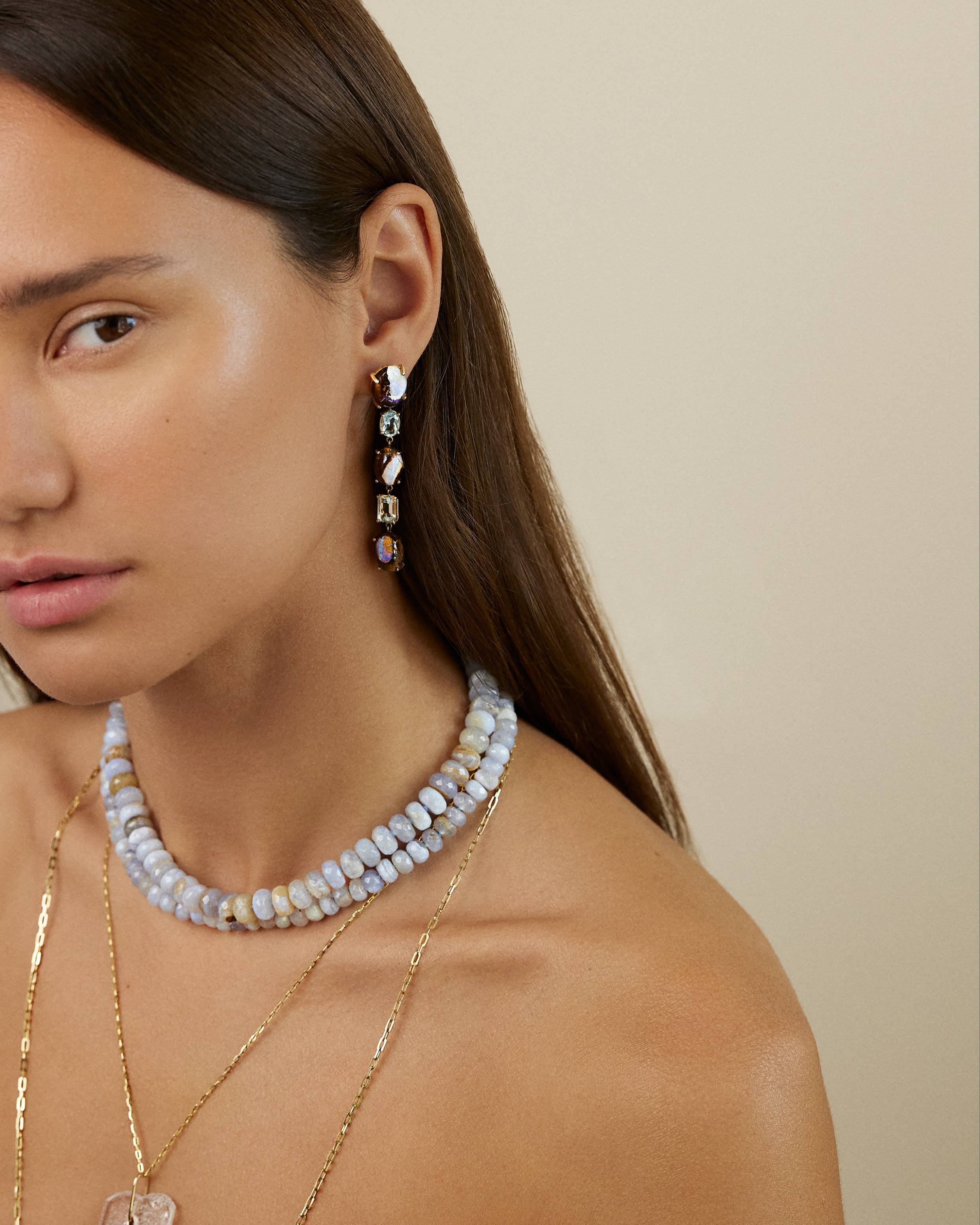 Each beaded jewelry piece is hand strung from the highest quality materials that are cut from natural mineral sources. They are sensitive to prolonged exposure to hairsprays and scents. To ensure longevity please be gentle and avoid tugging and pulling of these pieces.